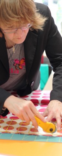 Er funktioniert wie eine Art Pizzamesser. Mit dem runden Messer wird der Stoff in der Rollbewegung ganz exakt und gerade geschnitten. Da man hier mit Druck von oben arbeitet, braucht man auch eine entsprechende Schneidematte dazu, sonst schneidet ihr womöglich in den Tisch. Wer also öfter geometrische Formen schneidet, wie zum Beispiel beim Patchworken oder Quilten, für den lohnt sich die Anschaffung eines Rollschneiders und einer Arbeitsmatte.