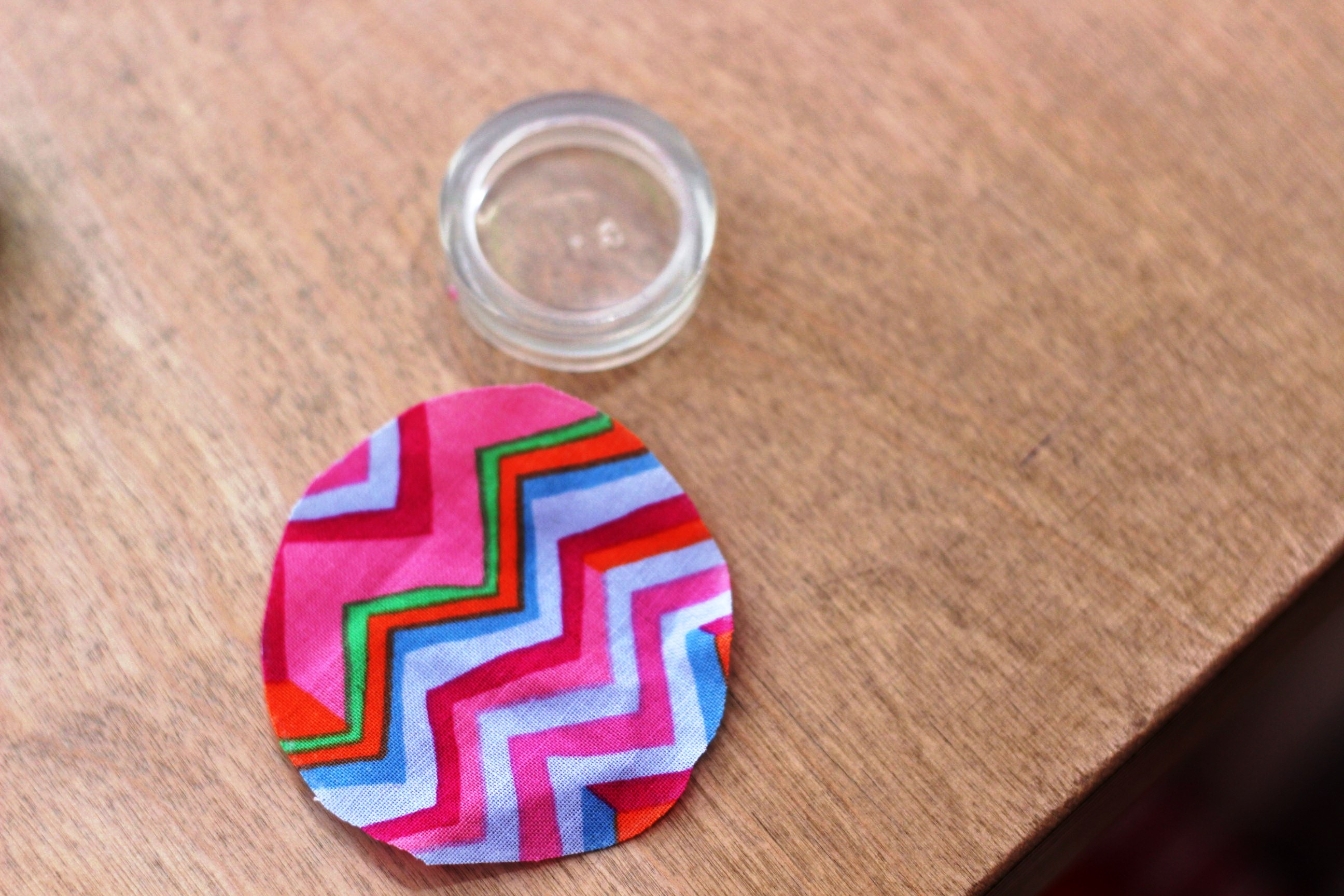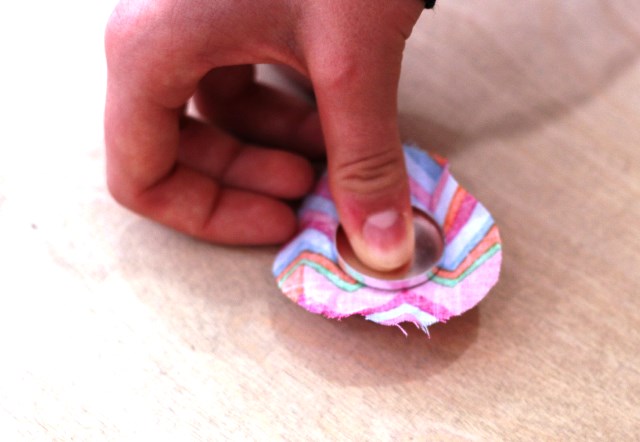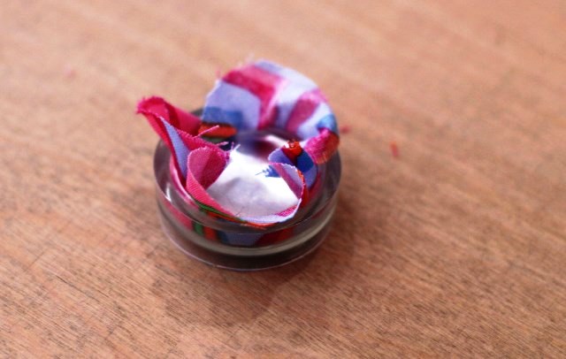 Jetzt den Kreis ausschneiden und über das runde Plastikteil legen. Wenn ihr wollt, könnt ihr noch ein wenig Füllwatte drauf legen, das plustert den Knopf ein bisschen auf und macht ihn stoßfester.