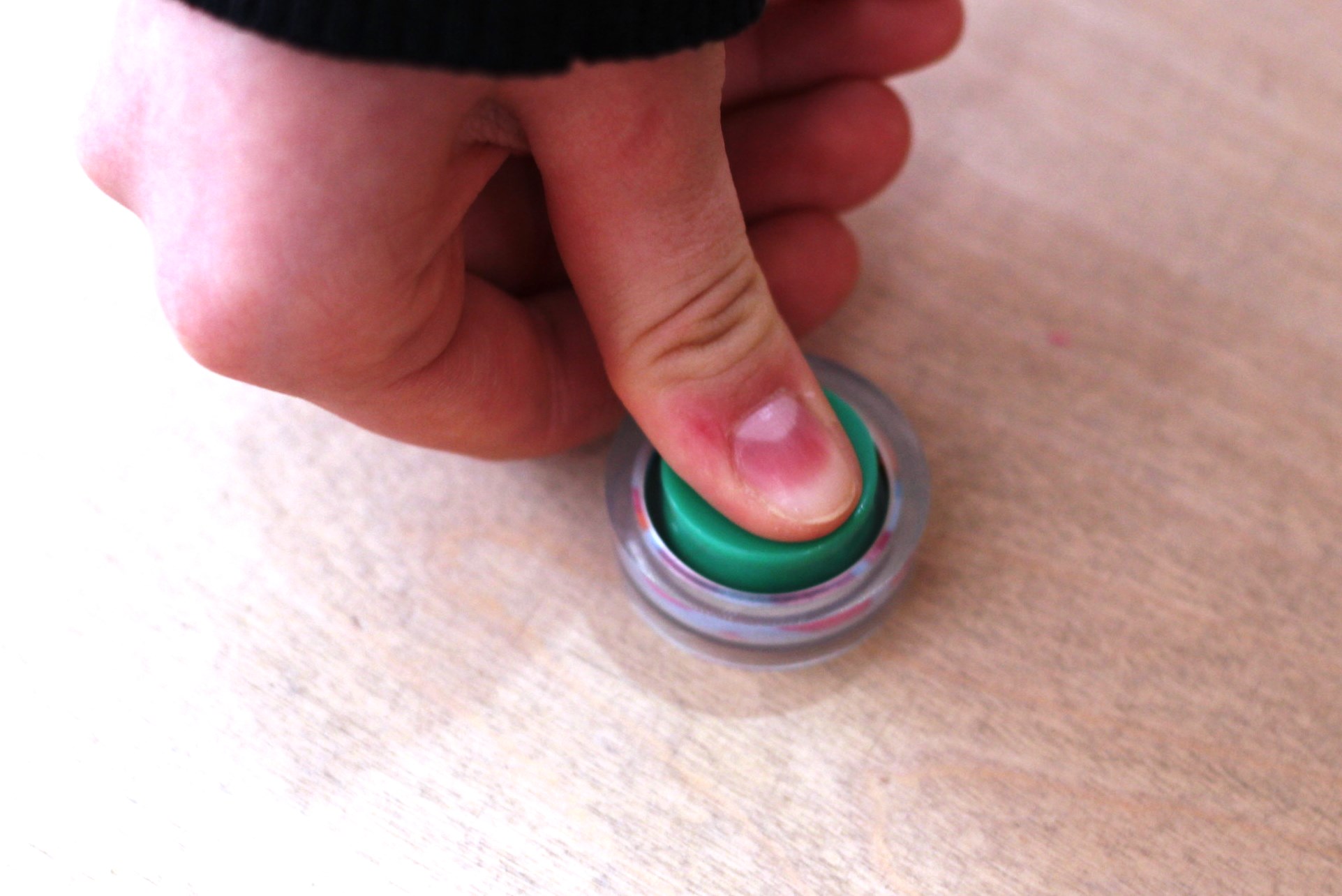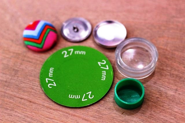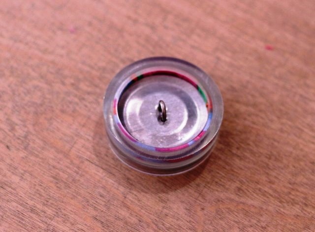 Zum Schluß wird der andere Teil des Knopfrohlings drauf gepresst. Dank seiner Zacken hakt er sich ein und der Knopf ist fertig.