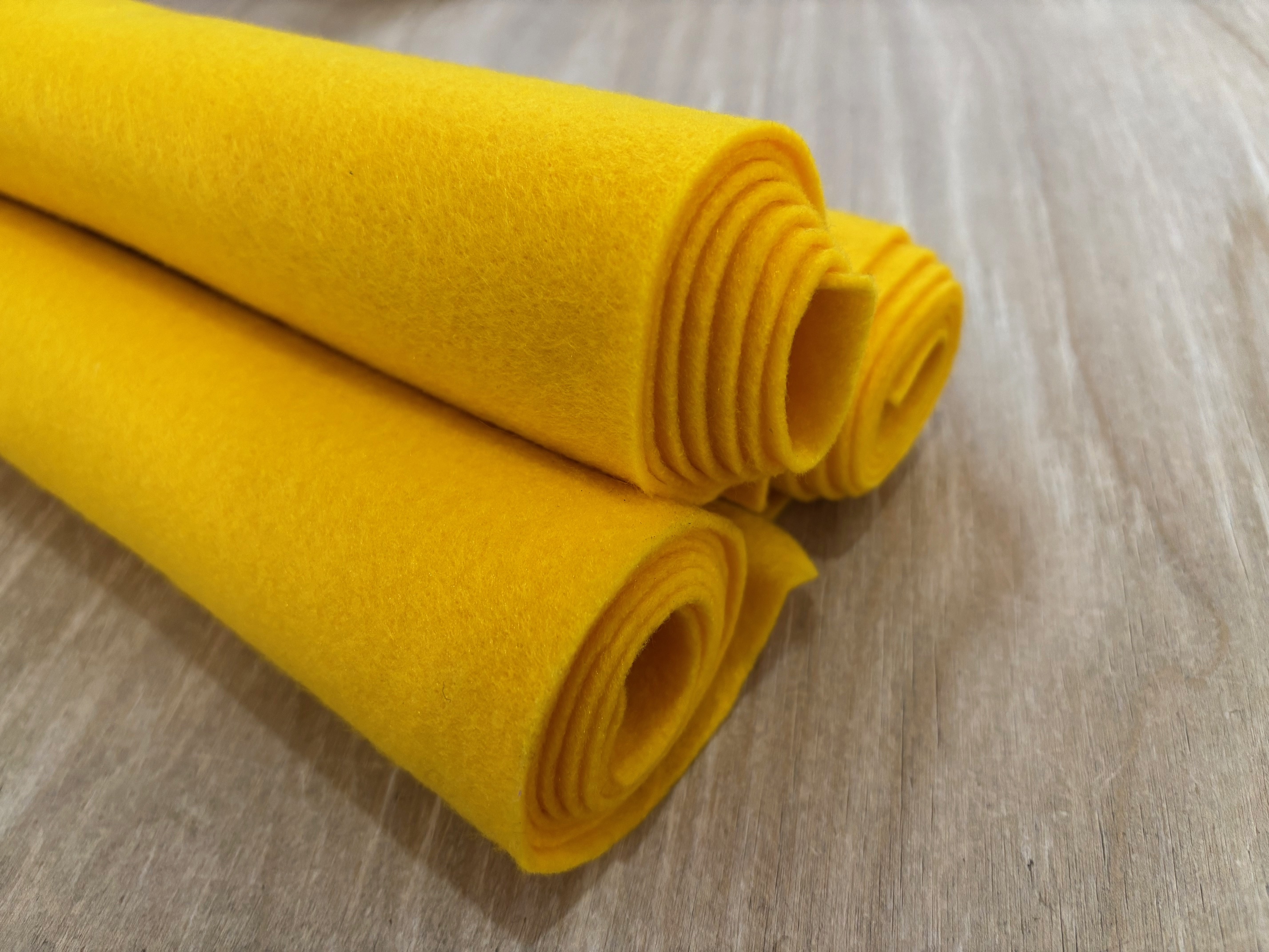 Bastelfilz, 100% Polyester, 1,5 mm dick, Stück 50 x 90 cm in leuchtendem Sonnengelb. Für Bastelarbeiten, Taschen, Unterlagen, Kostüme, Dekorationen, modische Accessoires und mehr.