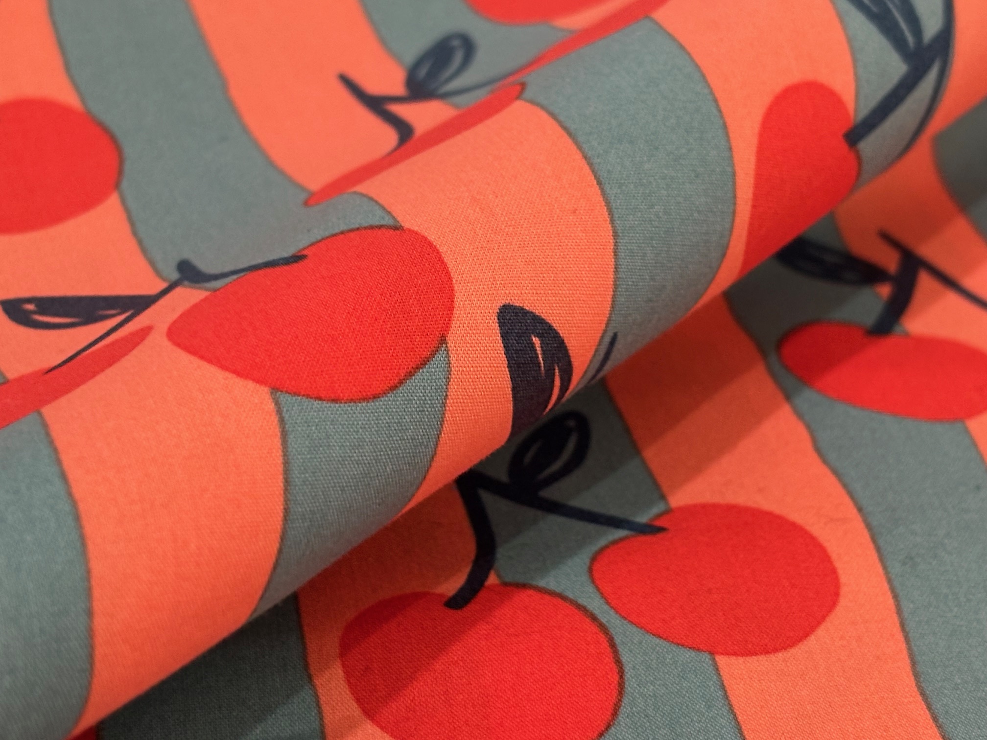 Süße Kirschen ess ich gern... Ein Paar rote Kirschen (5 cm breit) im Rapport auf frechen Streifen (2 cm) in hellem Koralle/Mintgrün. Tolle Farben, der Stoff macht an. Fruit von Poppy, für alles, was Dir gefällt. Blusen, Röcke, modische Accessoires, Heimtextilien, Taschen, Kindersachen und vieles mehr. 100 % Baumwoll-Popeline. 150 cm breit, 110 g/m².
