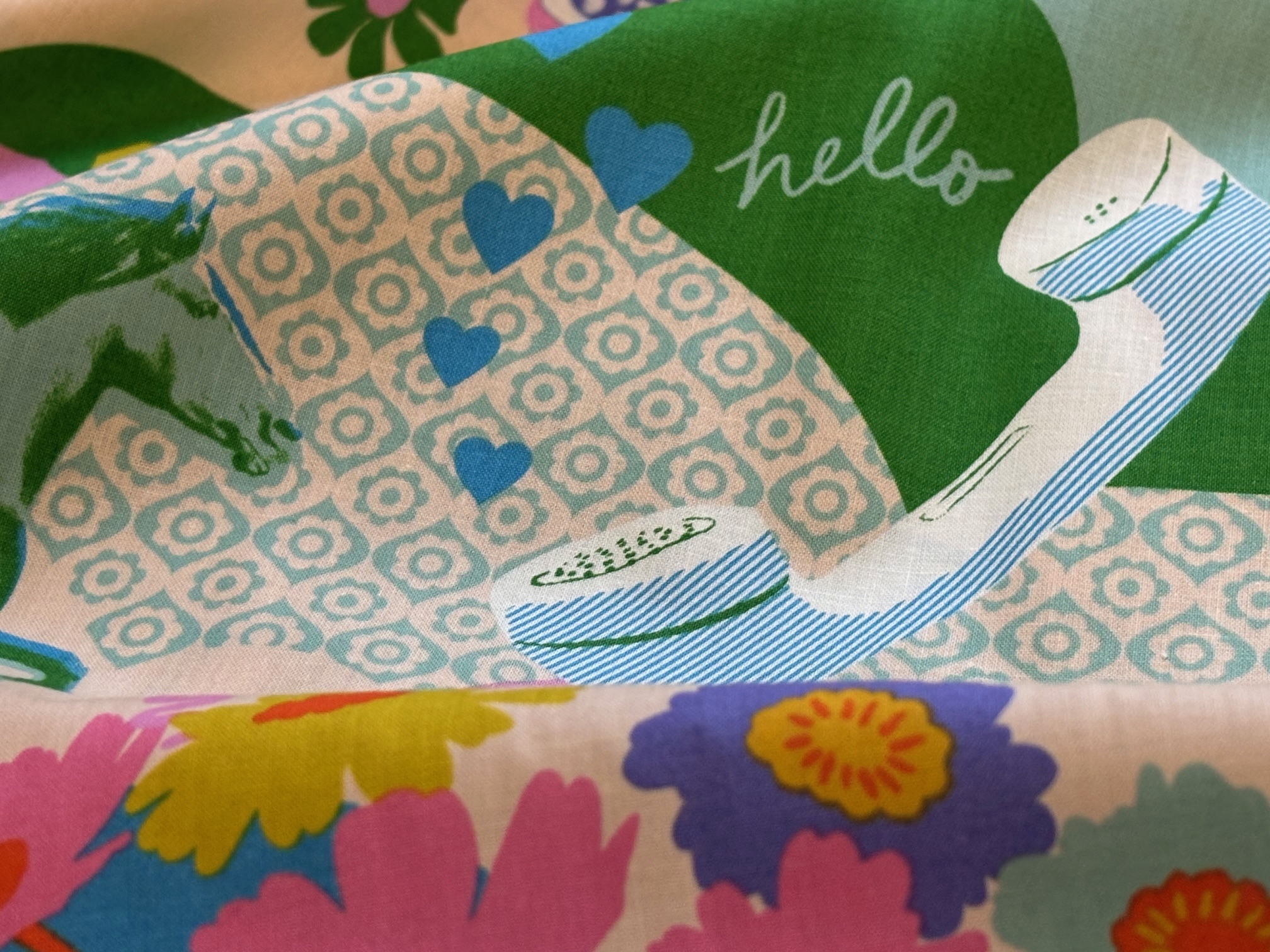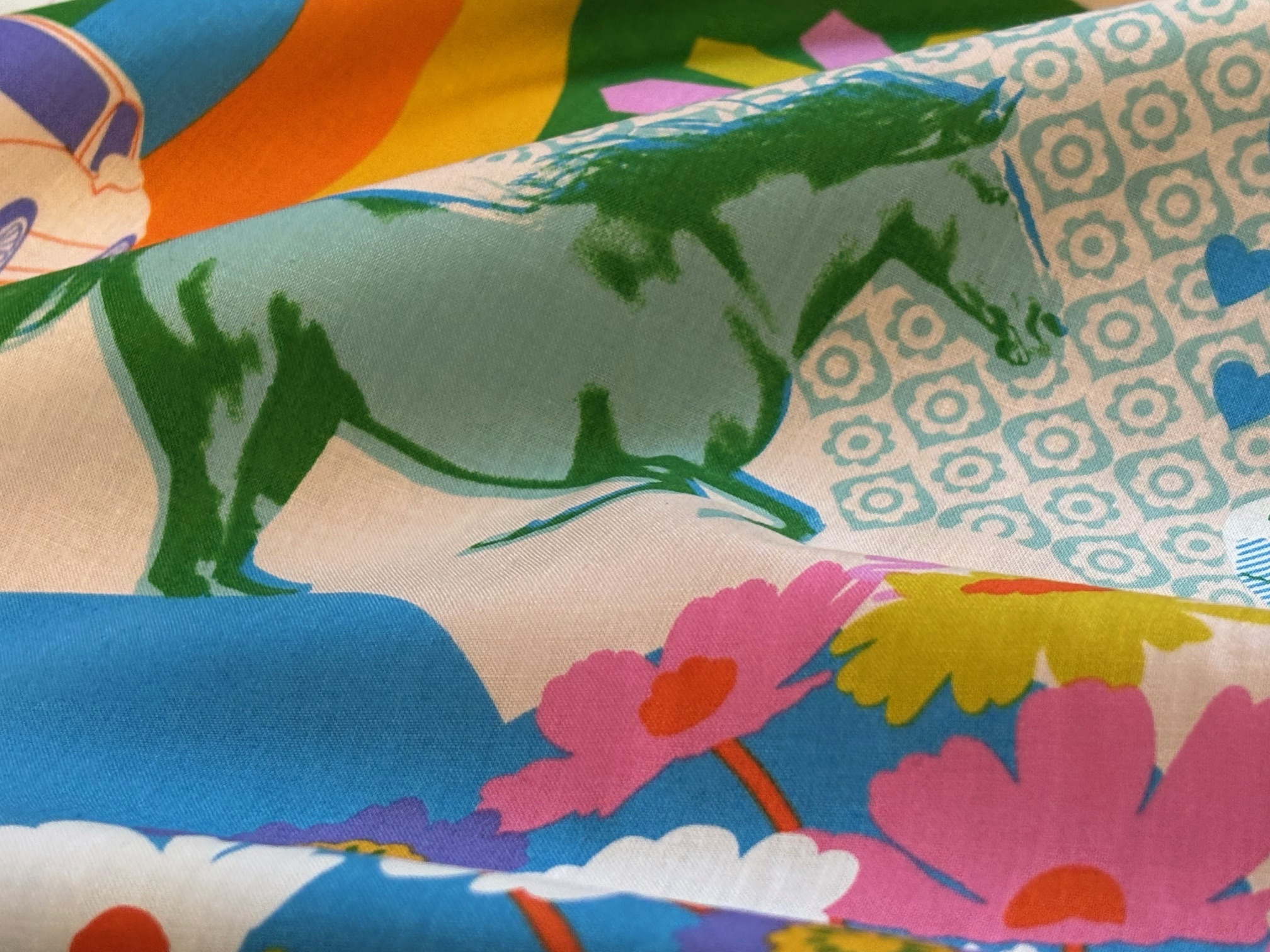 Bunt und Retro - Design von Melody Miller. Blumen, Telefonhörer, Pferd, Auto, Milchtüte, Softeis und Vögel - es gibt unendlich viel zu entdecken auf diesem Stoff. In kúnterbunten Farben. Ruby Star Society. Für modische Accessoires, Heimdeko, Taschen, Kissen, Röcke und natürlich auch für Kindersachen. 100% Baumwolle. Breite 110 cm.