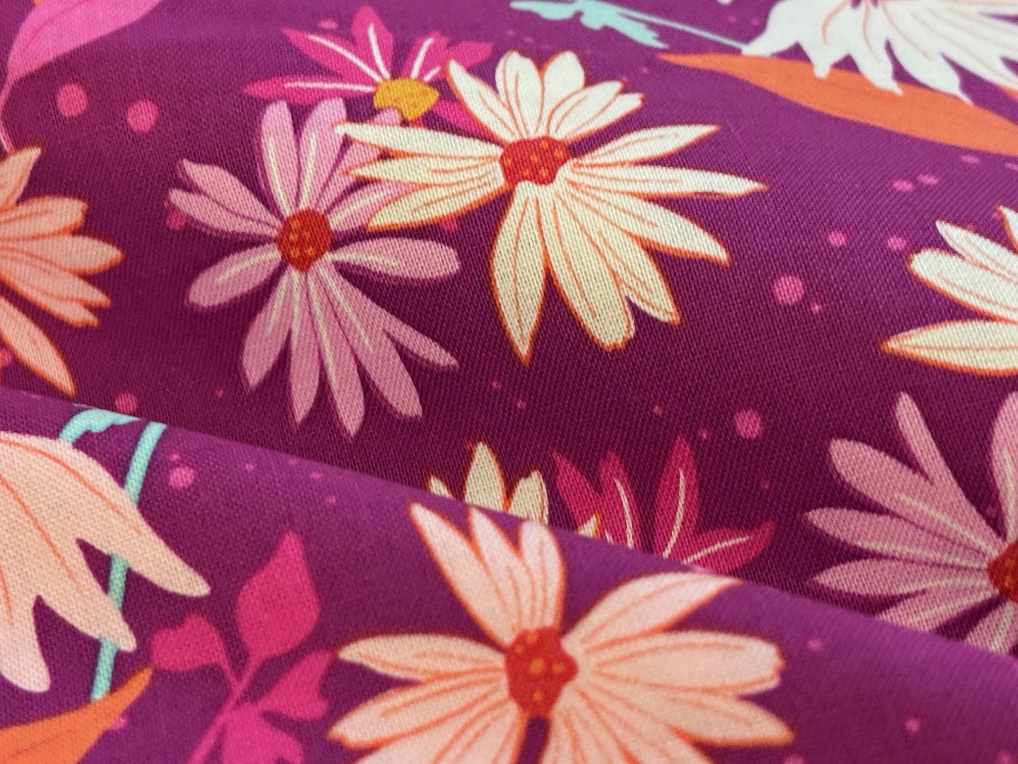 Blumenzauber - Design mit Echinacea-Blüten in intensiven Farben - Rosa, Rot, Orange und Pink auf intensivem Fuchsia. Stephanie Organes für Andover. Für modische Accessoires, Heimdeko, Taschen, Kissen, Patchwork und Quilts und vieles mehr. 100% Baumwolle, 110 cm breit.