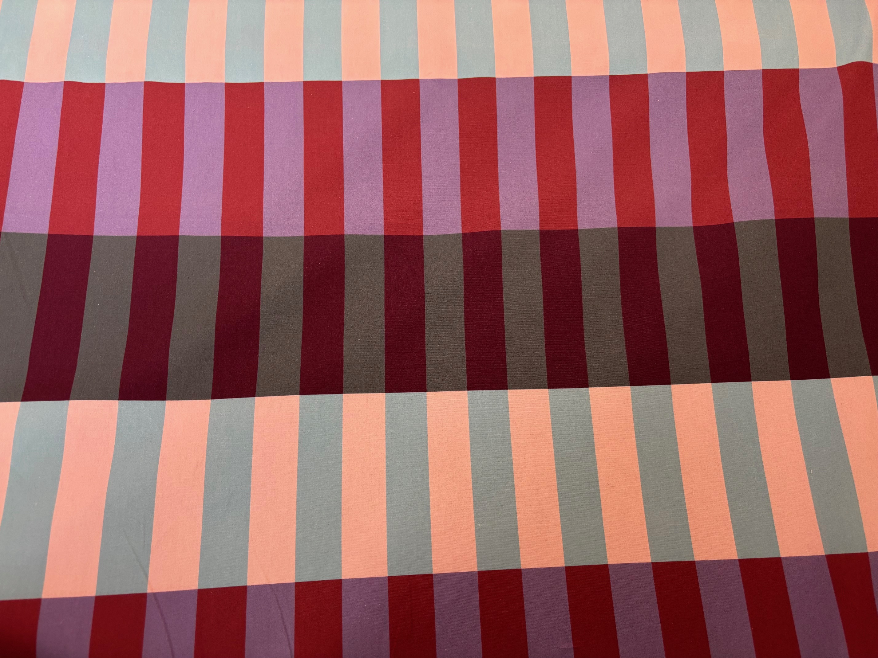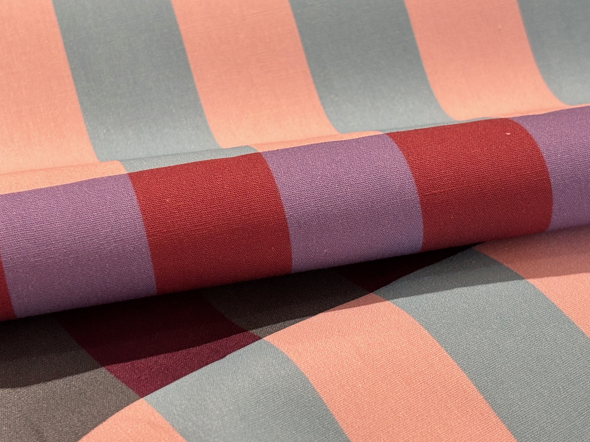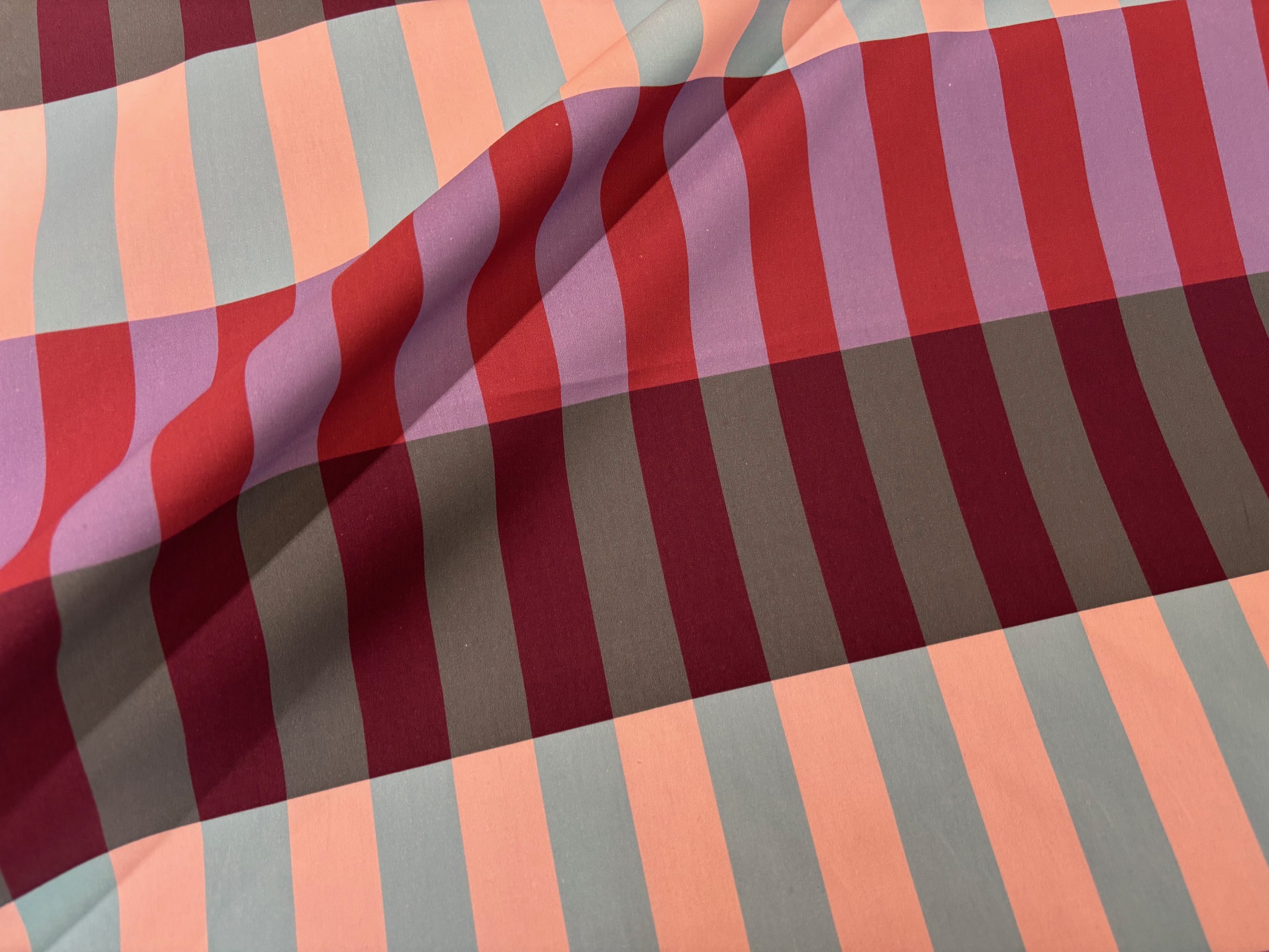 Interessantes Design, Blockstreifen (10 cm breit), die wiederum gestreift sind (2,5 cm breit) in ästhetisch abgestimmten Farbspektrum. Rosé, Türkis, Violett und Rostbraun, Tannengrün und Bordeaux. Superpur, vielseitig kombinierbar, mit toller Fernwirklung. Daraus kann man sich einfach alles vorstellen - modische Accessoires, Heimtextilien, Taschen, Röcke, Blusen, Kleider und vieles mehr. 100% Baumwolle, 115g/m ², 150 cm breit.