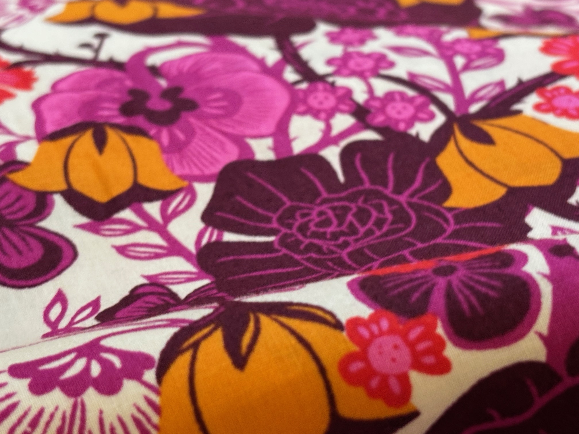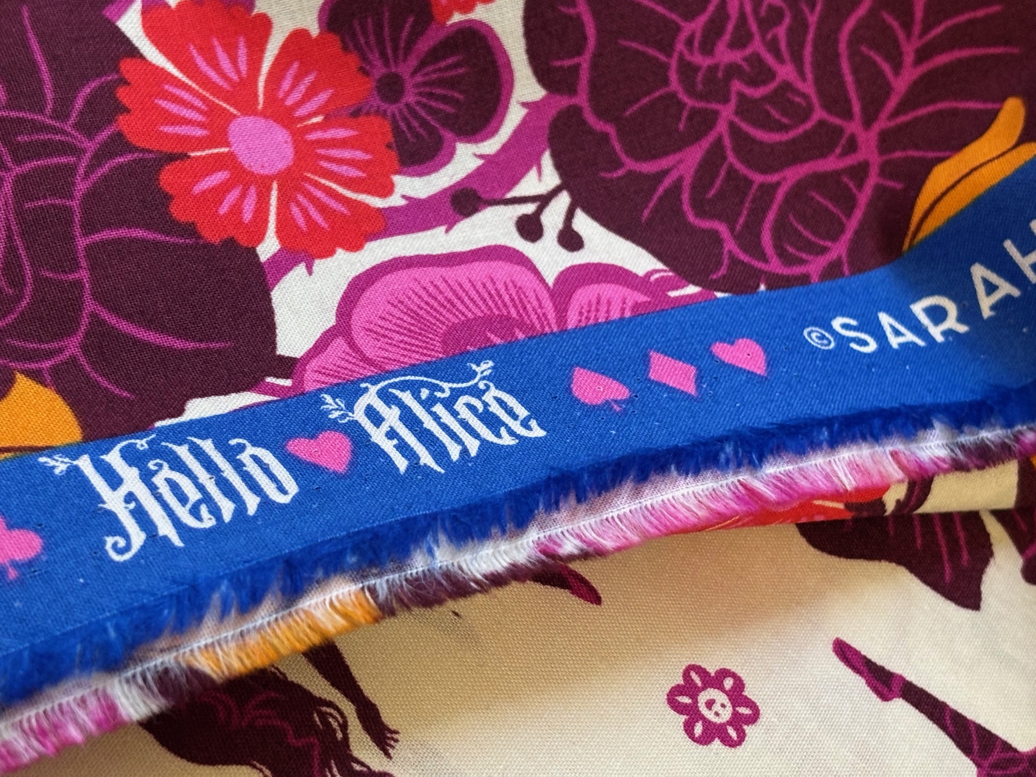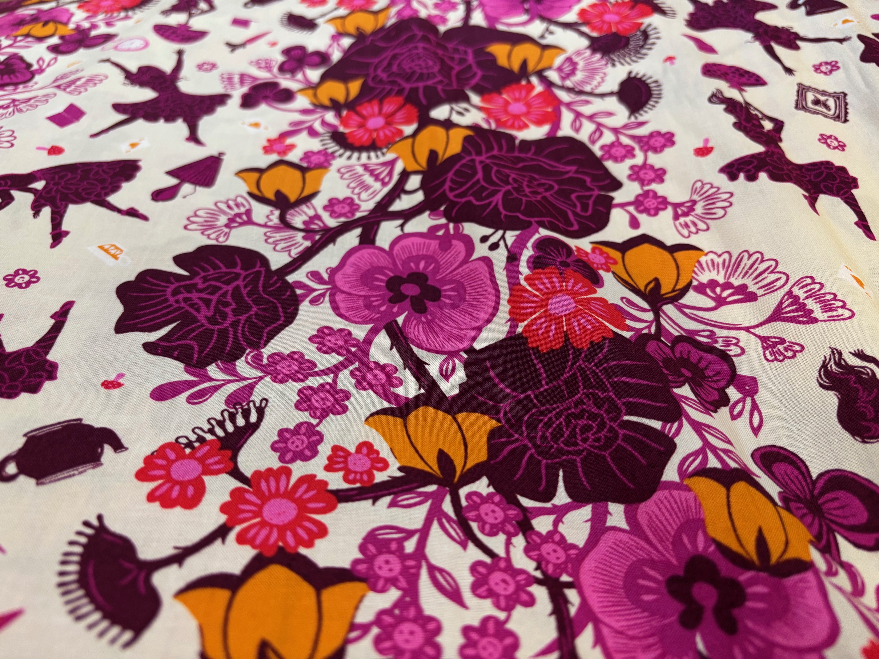 Atemberaubende Blumen in starken Farben - Pink, Bordeaux, Rot und Orange. Dazwischen schwebt Alice mit ihrem Regenschirm, Teekannen, Bücher, Taschenuhren und Möhren fliegen durch die Luft. Wunderland lässt grüßen. Aus der Kollektion Hello Alice von Sarah Watts, Ruby Star Society. Für modische Accessoires, Heimdeko, Taschen, Kissen, Vorhänge und natürlich auch für Kindersachen. 100% Baumwolle.