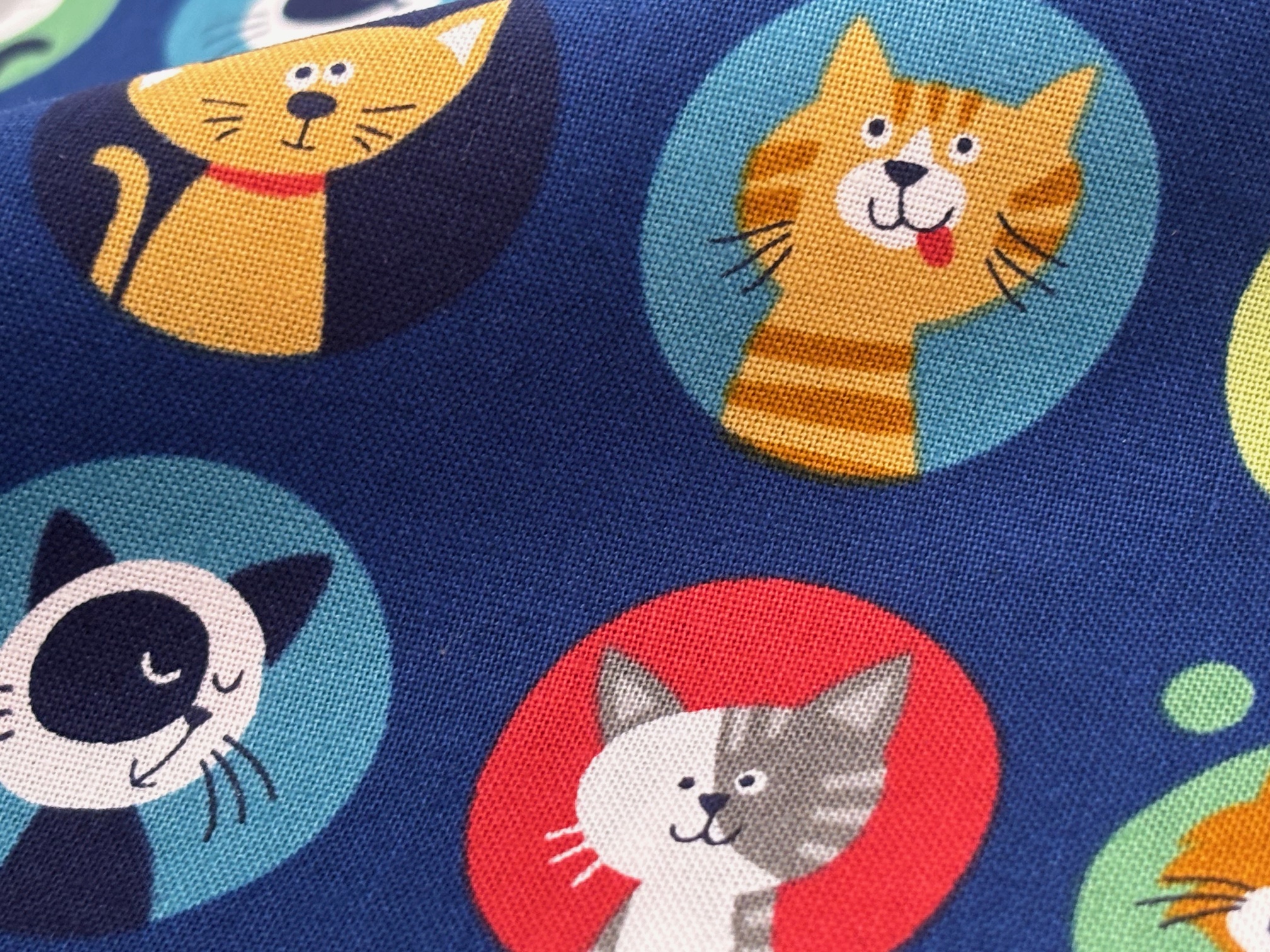 Der Hit für Kinder und Katzenfans - lustig bunte Katzen in Kreisen (3 cm). Rot, Grün, Blau , Hellbraun und Weiß auf Dunkelblau. Von un/nö, Stoff aus Japan. 100% Baumwolle, 110 cm breit