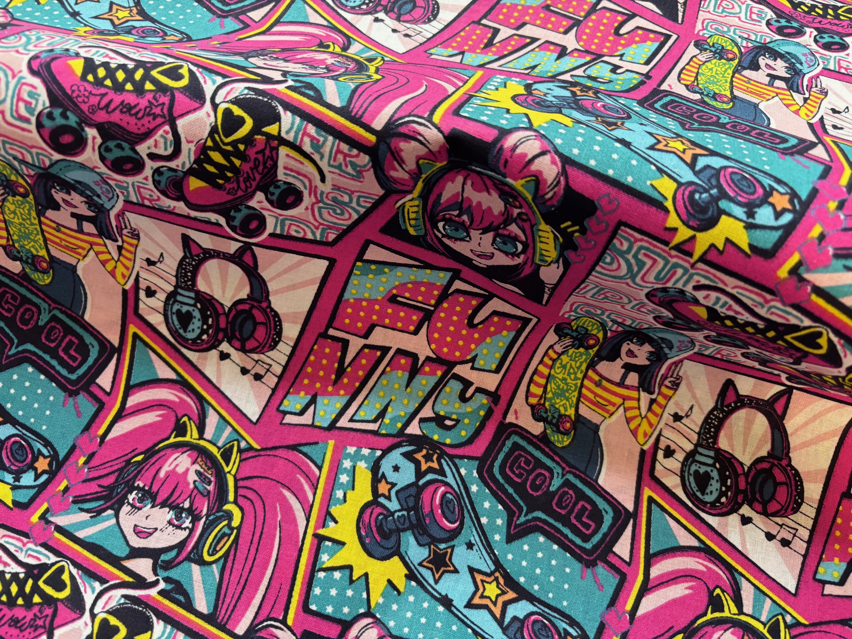 WOW - hier knallt's! Comic mit Mangaartigen Figuren, coole Girls mit Skateboard, Inlinern und Kopfhörer, alles in Pink, Gelb und Türkis. 100 % Baumwolle/Cretonne - griffige, ein bisschen festere Qualität, für selbstgenähte Kreationen, die einfach mega aussehen! 160 cm breit.