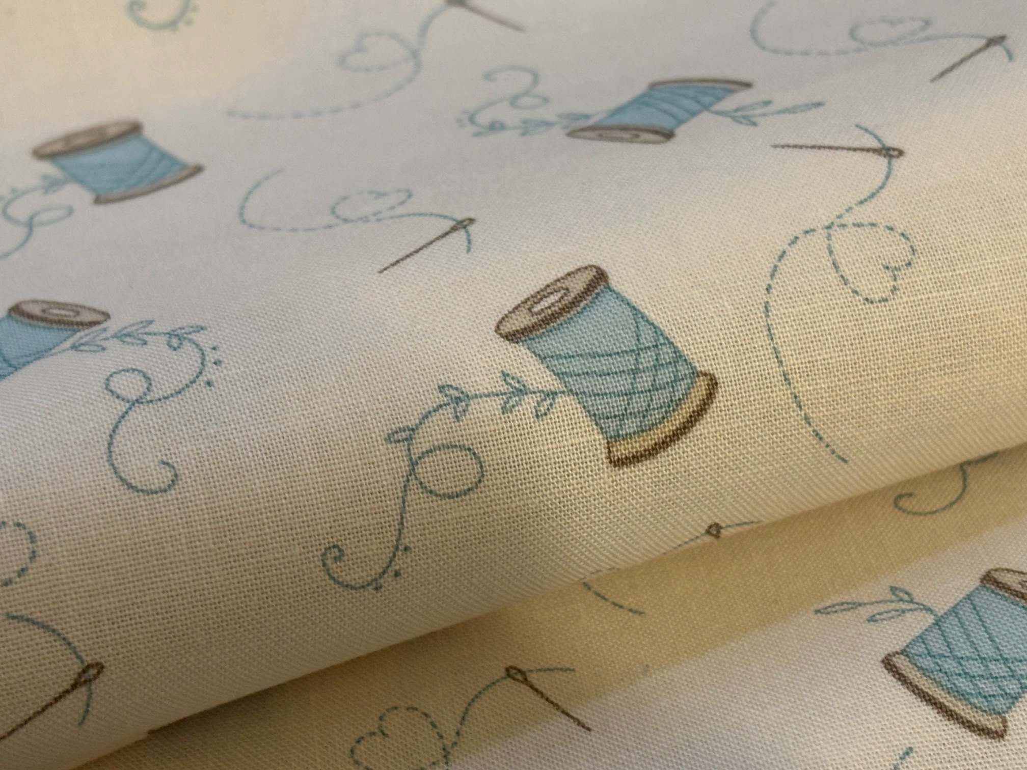 Hier wird mit der Hand genäht, Nähnadel und blaue Garnrollen prägen das Design dieses Stoffes. Der perfekte Stoff für Hobbyschneider*innen. 100% Baumwolle, 110 cm breit. Needle and Thread, Andover. Für Kissen, Vorhänge, Taschen, Nähmaschinenhauben, Accessoires und vieles mehr.