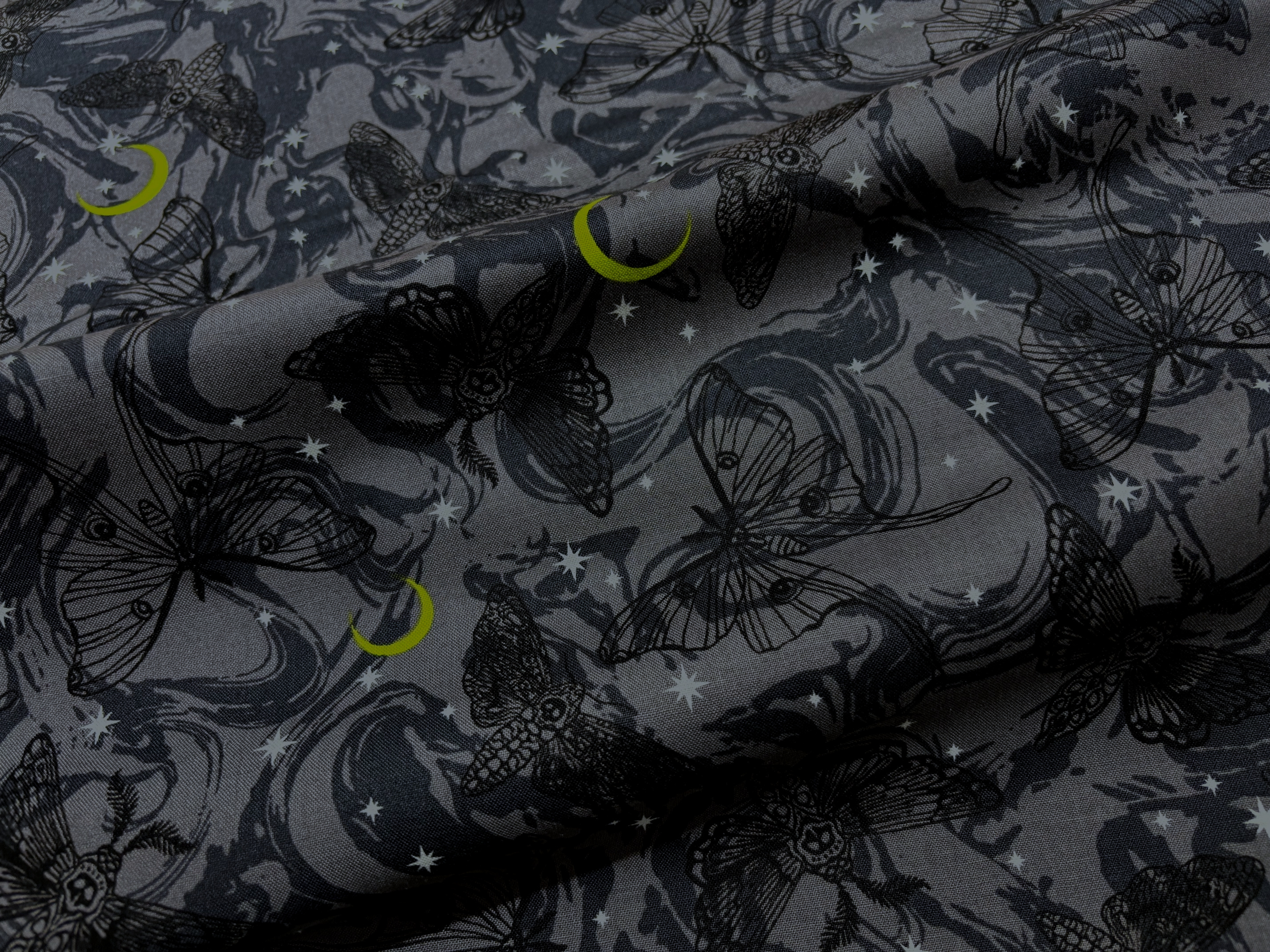 Nachtfalter und Motten umschwärmen den leuchtend neongrünen Halbmond. Tolles Motiv, auch zu Halloween. Ton-in-Ton Schwarz. 100% Baumwolle, 110 cm breit. Für Accessoires, Heimtextilien, Taschen, Kostüme und mehr.