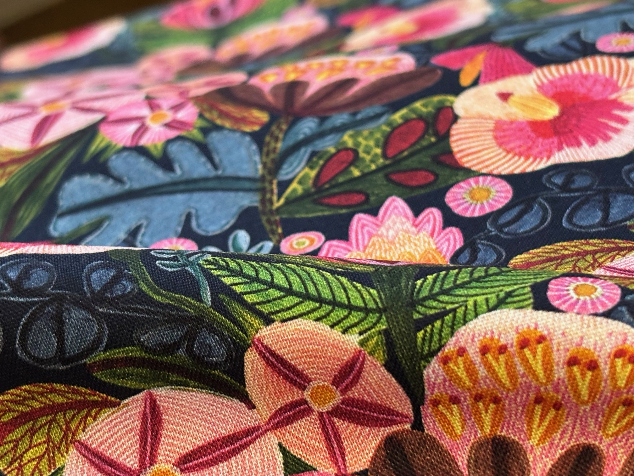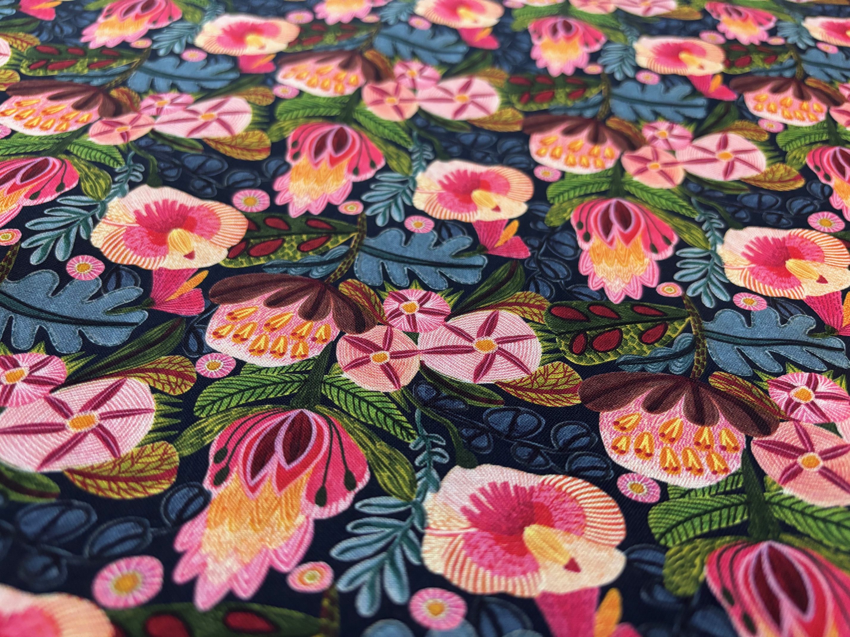 Entchanted Paradise - stilisierte Blumen in leuchtenden Farben - Rosa, Pink, Bordeaux und Gelb - auf dramatisch dunklem Hintergrund aus Blautönen und Grün. Zum Eintauchen. Aus der Kollektion Paradise Blooms von Kirsten Katz, Spirit to create. Für modische Accessoires, Heimdeko, Taschen, Kissen, Vorhänge und so viel mehr. 100% Baumwolle.
