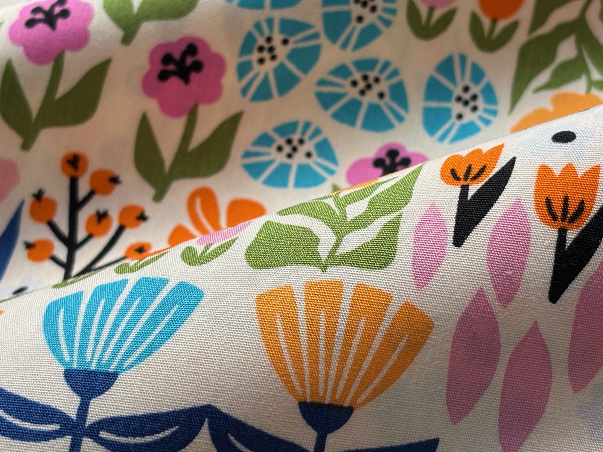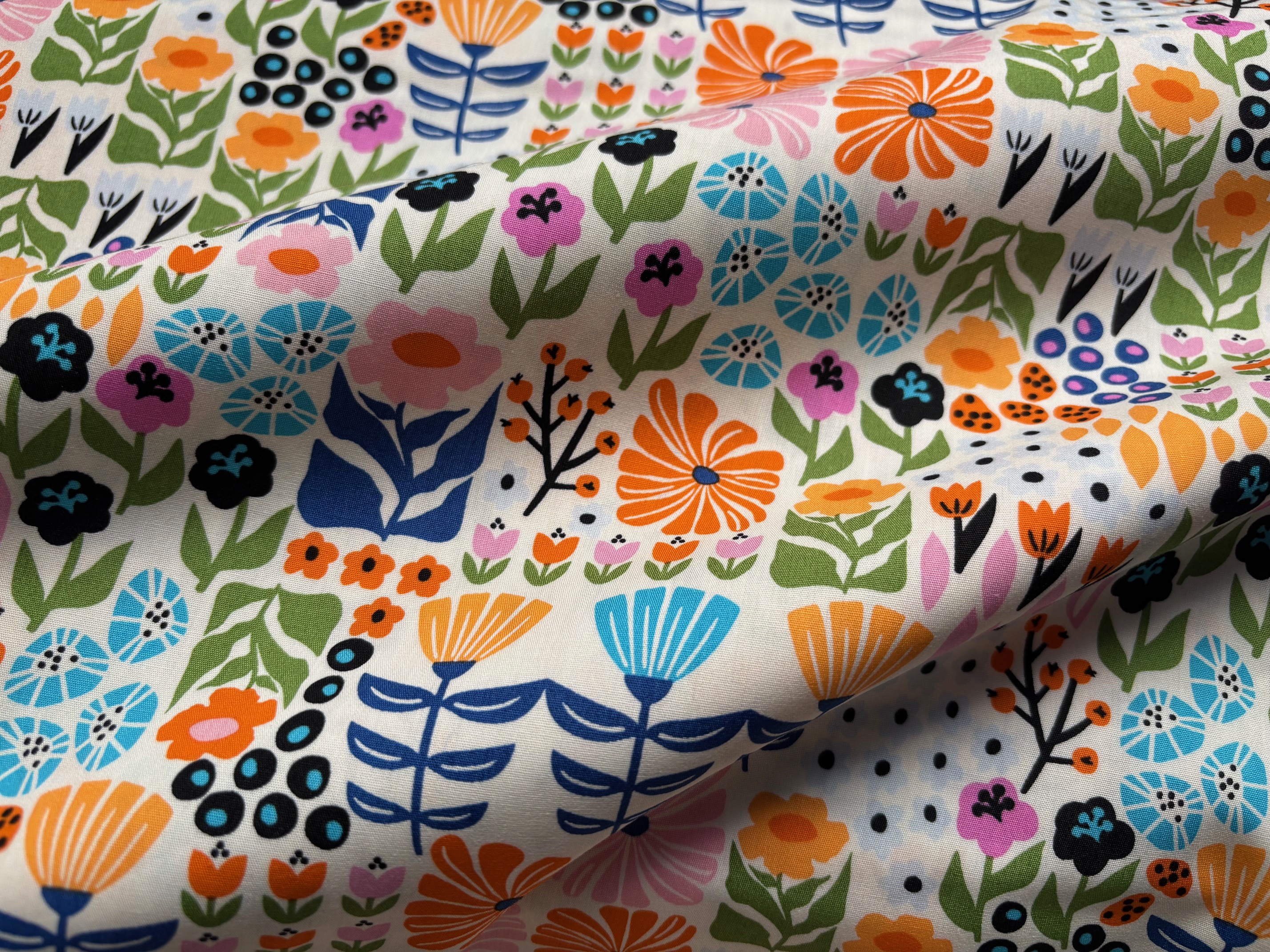 Bunte Blumenwelt im Patchworklook. The Cur8tor Modernista. In Orange, Grün, Rosa, Türkis auf Naturweiß. Für Heimtextilien, Modeaccessoires, Patchwork- und Quiltdecken und vieles mehr. 100% Baumwolle, 110 cm breit