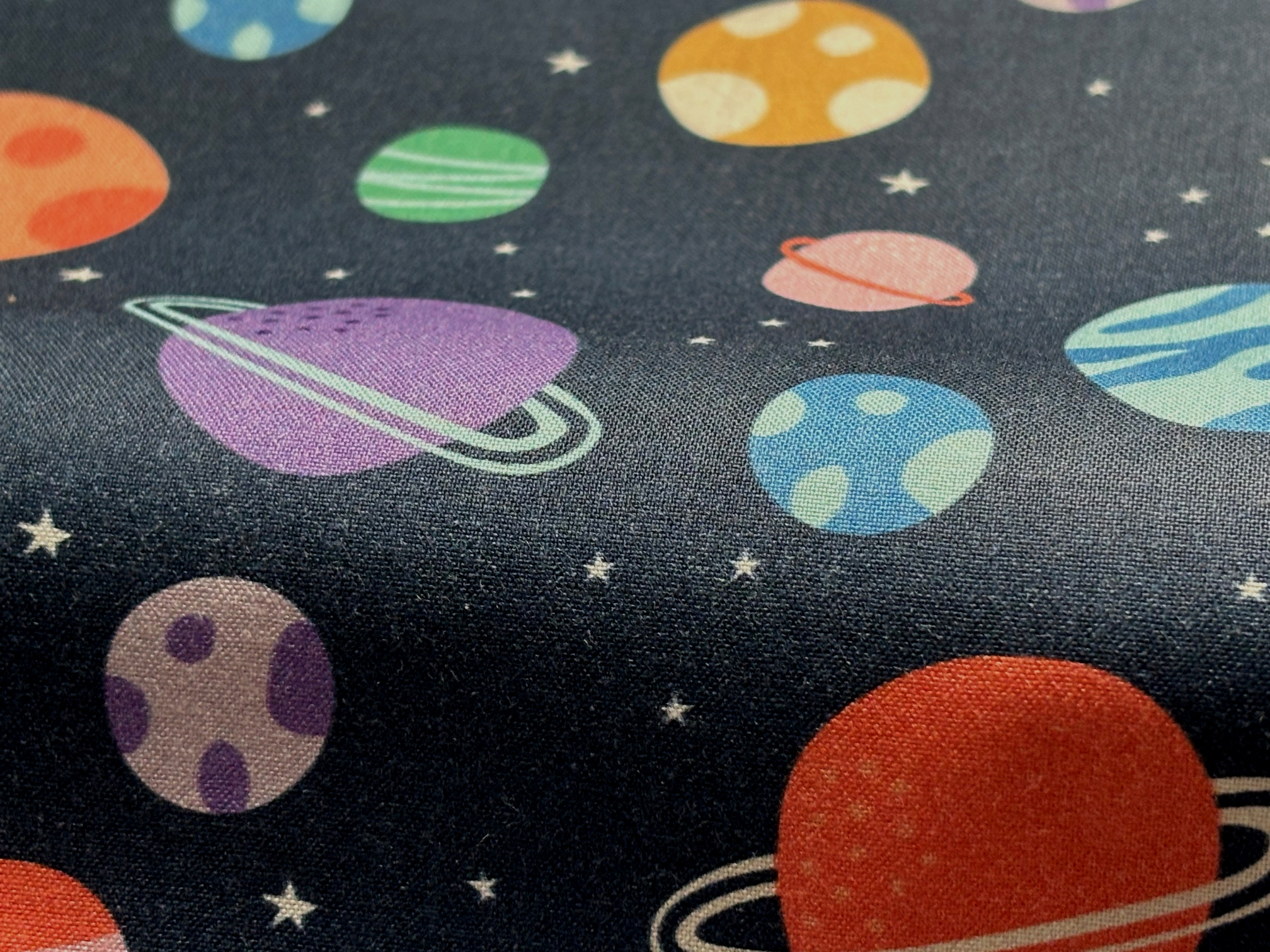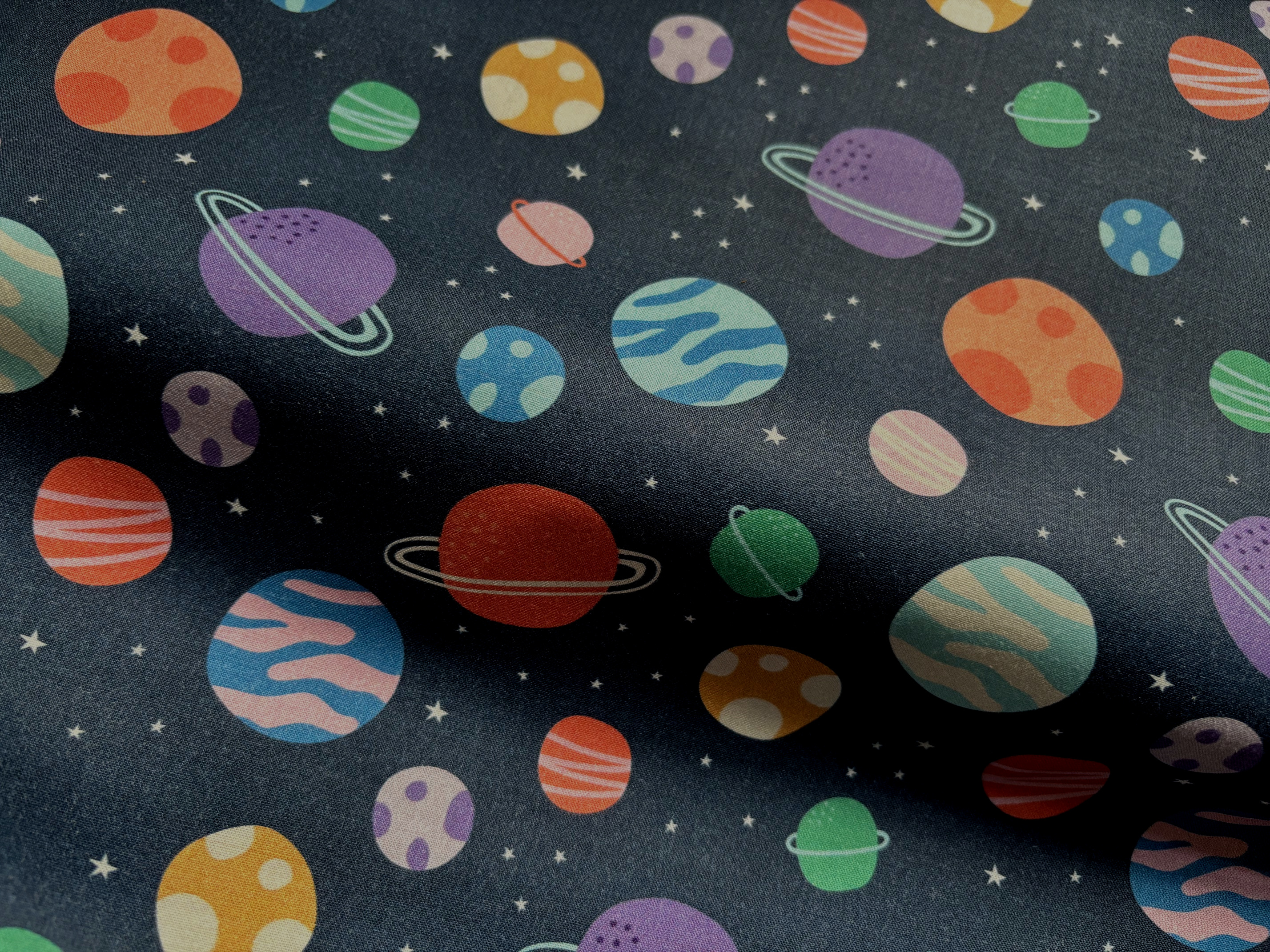 Kunterbuntes Planeten-Universum auf Dunkelblau. Mit Sternchen. 100% Baumwolle, 110 cm breit.