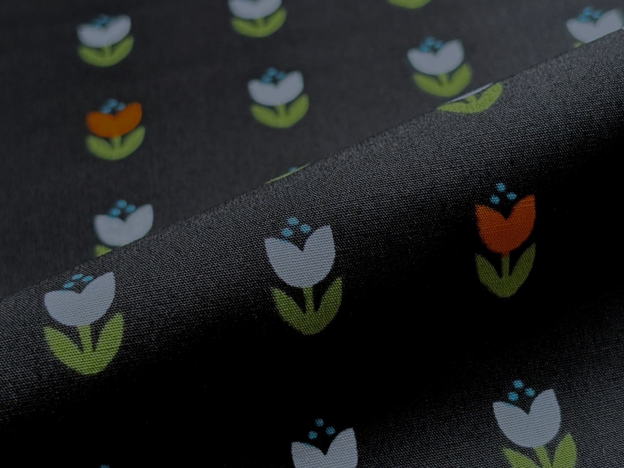 The Cur8tor Modernista. Kleine Tulpen 1 x 2 cm) im Rapport. In Orange, Grün. Türkis und Weiß auf Tiefschwarz. Für Heimtextilien, Modeaccessoires, Patchwork- und Quiltdecken und vieles mehr. 100% Baumwolle, 110 cm breit