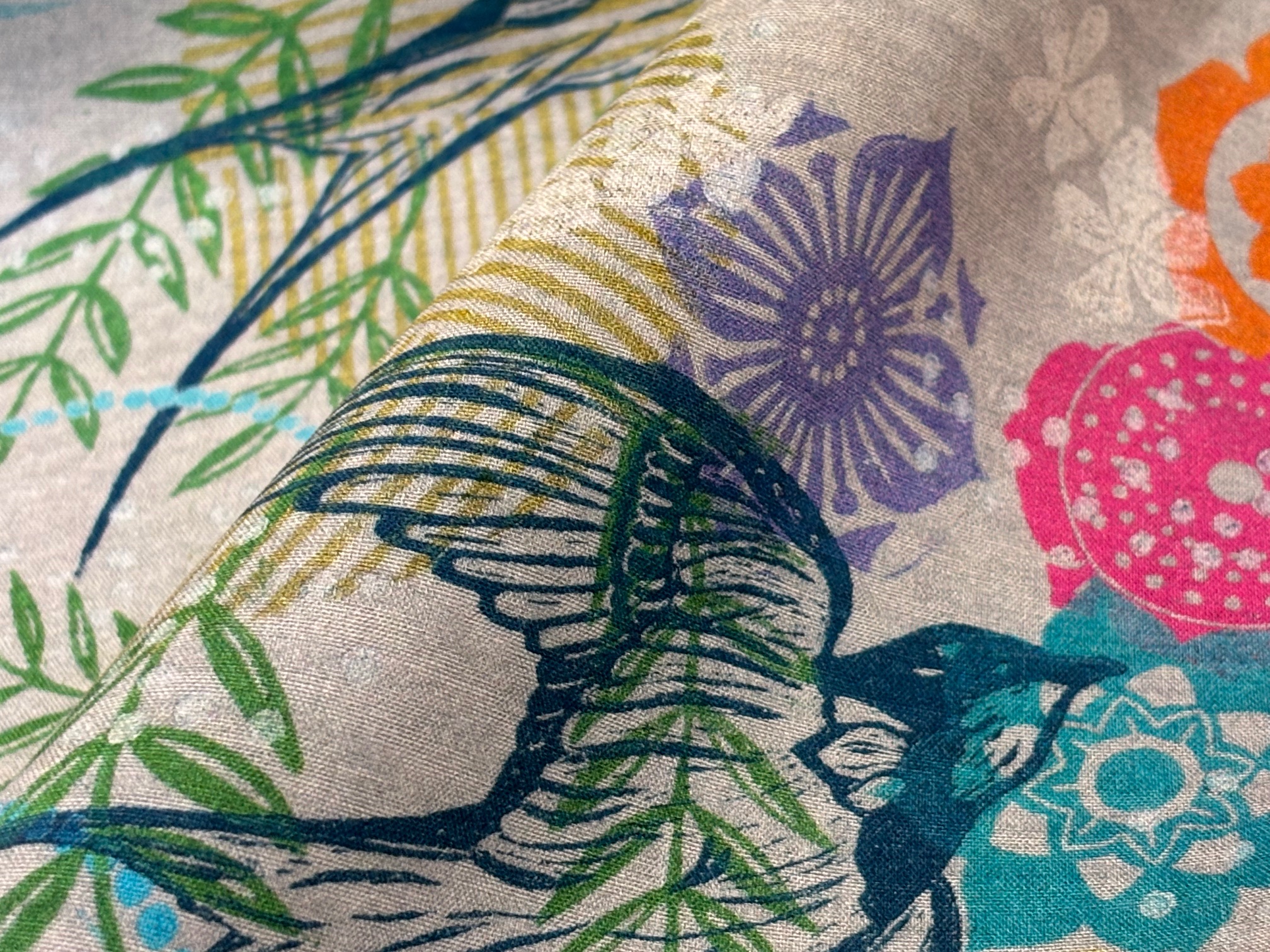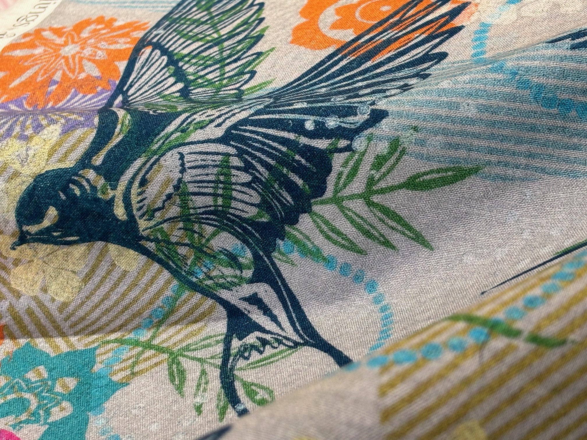 Dieser Stoff ist ein Ereignis. Große Schalben (18 x 18 cm) in Dunkelbau zwischen bunten Blüten, Blättern und Ornamenten in Violett, Türkis, Grün, Pastell gelb und Weiß, akzentuiert mit leuchtendem Neon Pink und Neon Orange. Im Hintergrund getupfte Kreise und schraffierte Flächen, atemberaubend schön. Alles auf hellgrauem Untergrund. man kann sich gar nicht sattsehen, an diesem Traumdesign von Valori Wells, Free Spirit. 100% Baumwolle, 120g/m ², 110 cm breit.