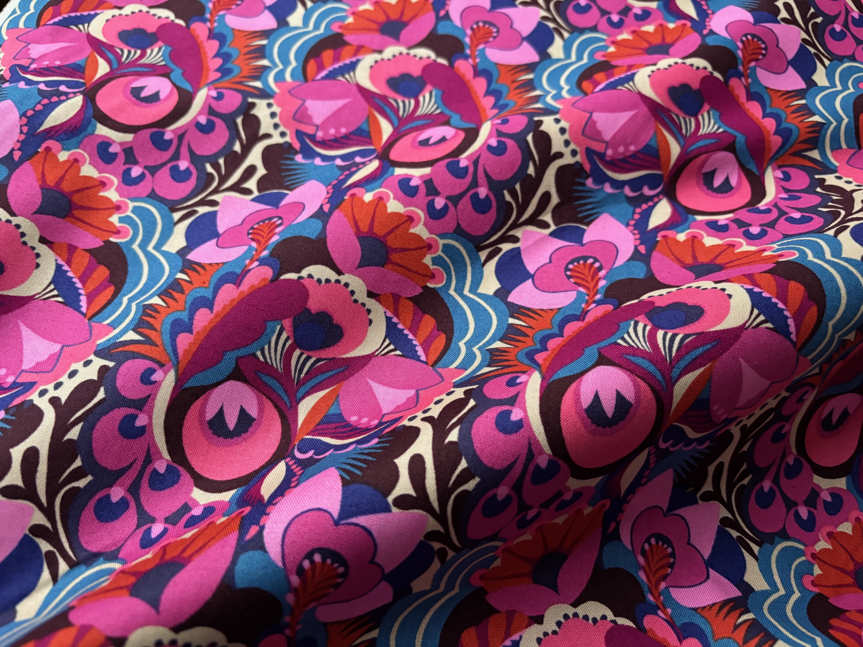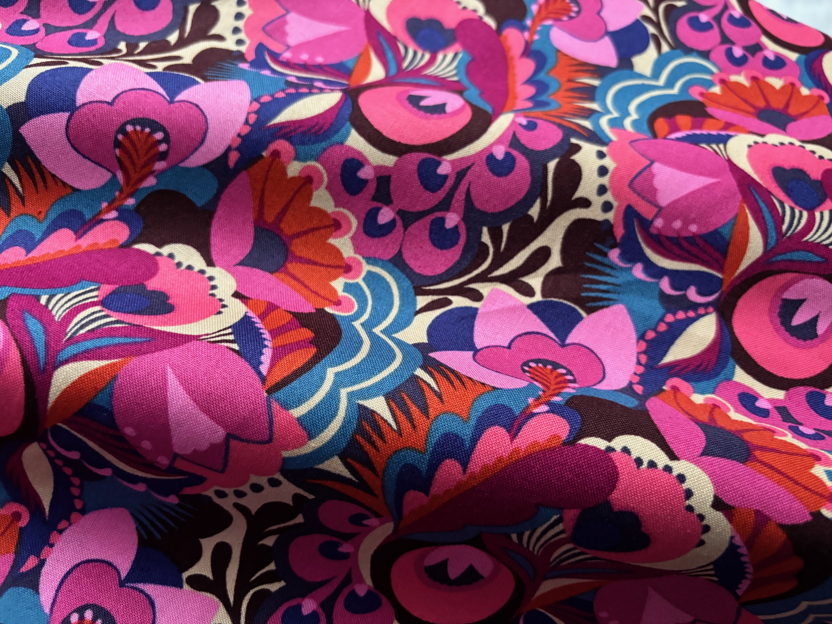 Eintauchen in ein Meer von Blumen, Beeren und Ornamenten in Pink, Violett und Blau. Ein Traumstoff von Anna Maria Horner. Für Heimtextilien, Modeaccessoires, Patchwork- und Quiltdecken, Röcke u.v.m. 100% Baumwolle, 110 cm breit