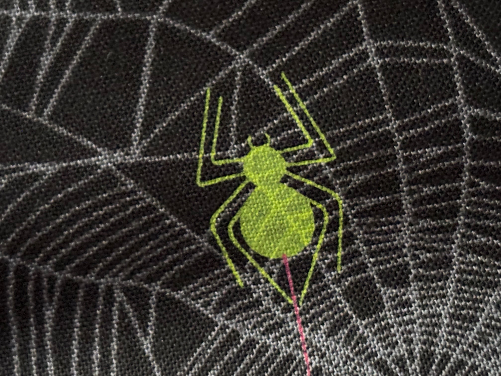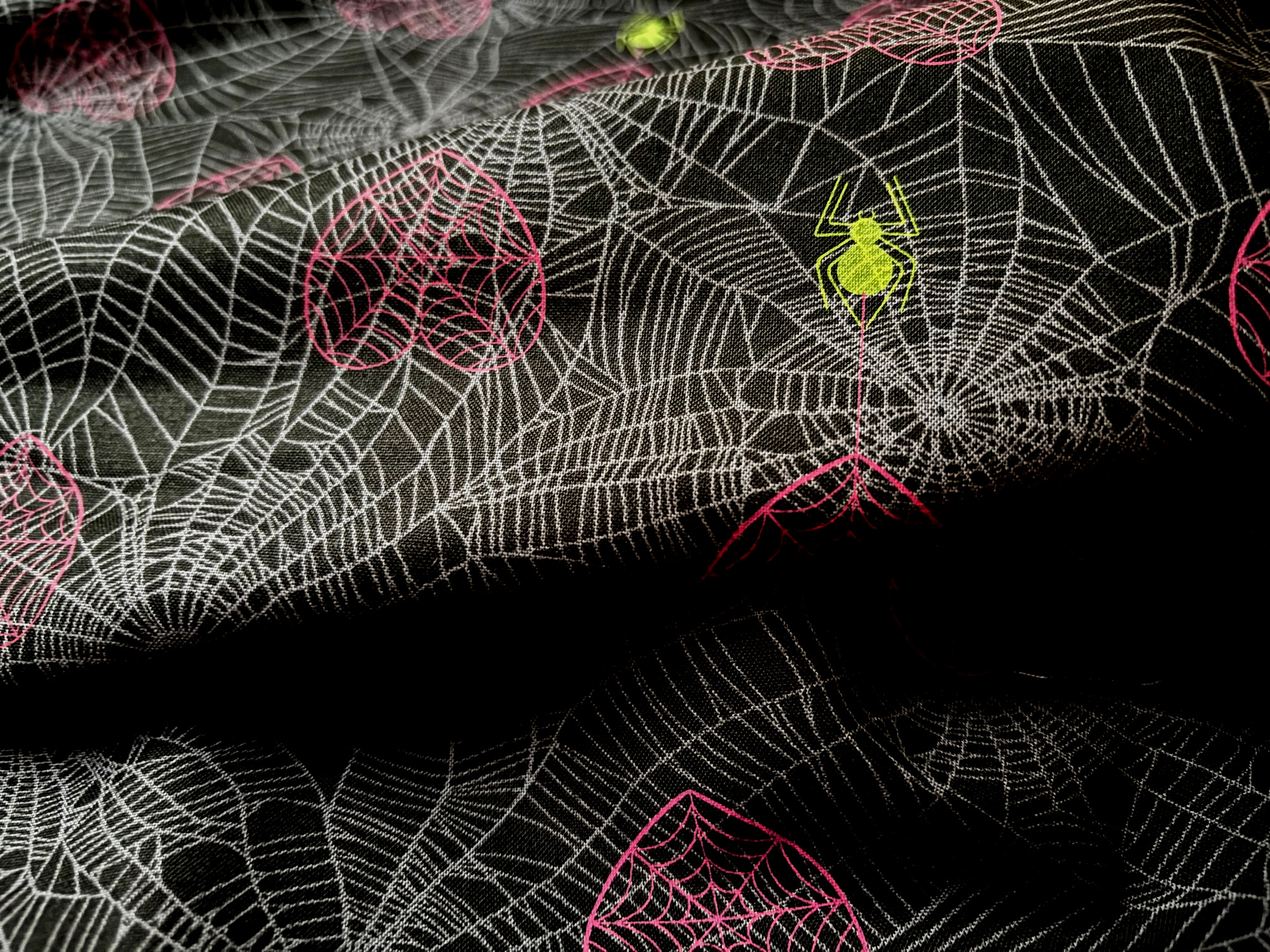 Hier krabbelt eine leuchtend grüne Spinne im Netz. Ein rotes Herz hat sie gleich mit eingewebt. Untergrund Schwarz. Der Stoff ist nicht nur zu Halloween der Hit. 100% Baumwolle, 110 cm breit. Für Accessoires, Heimtextilien, Taschen, Kostüme und mehr. Von Andover Fabrics.