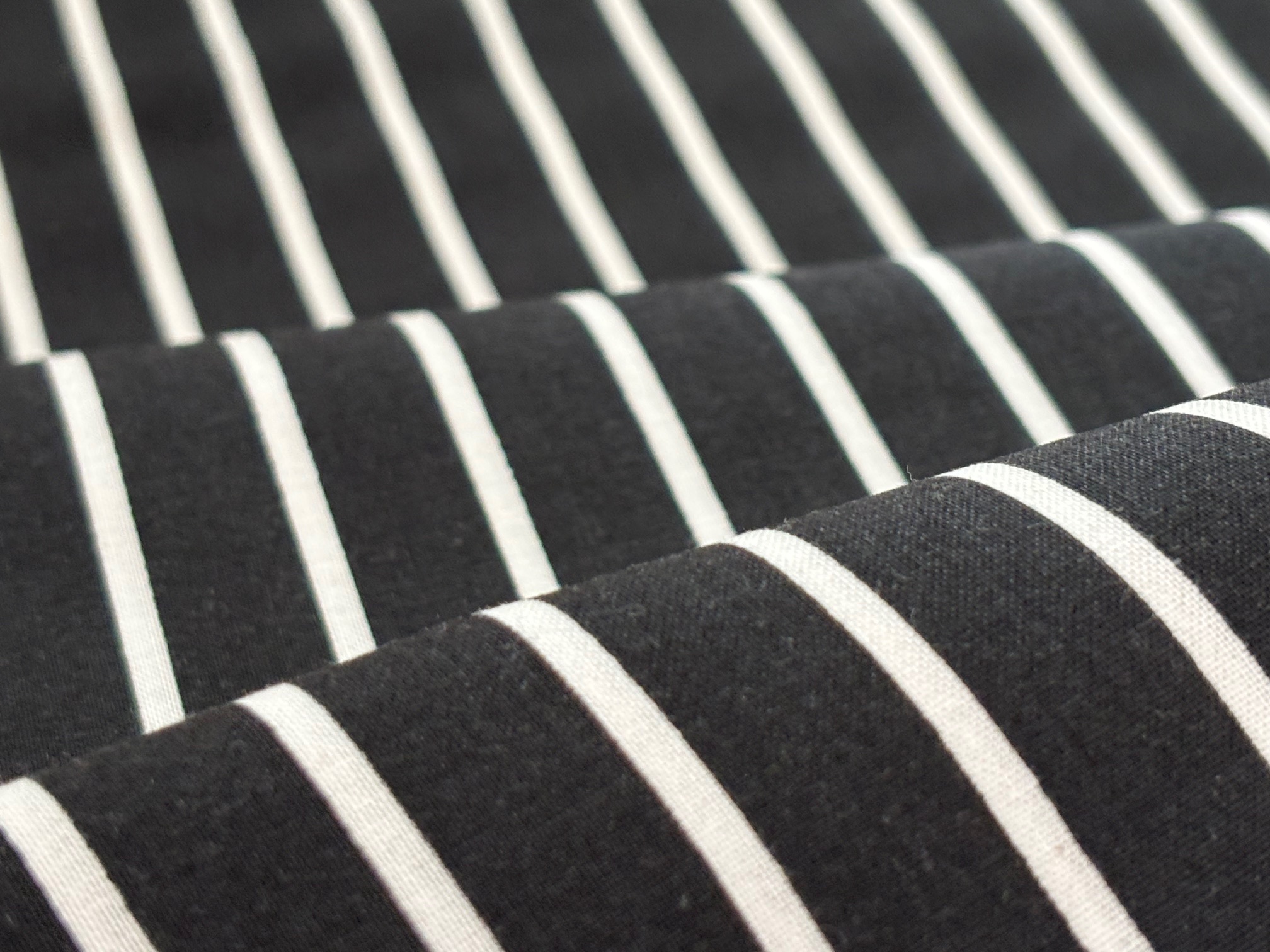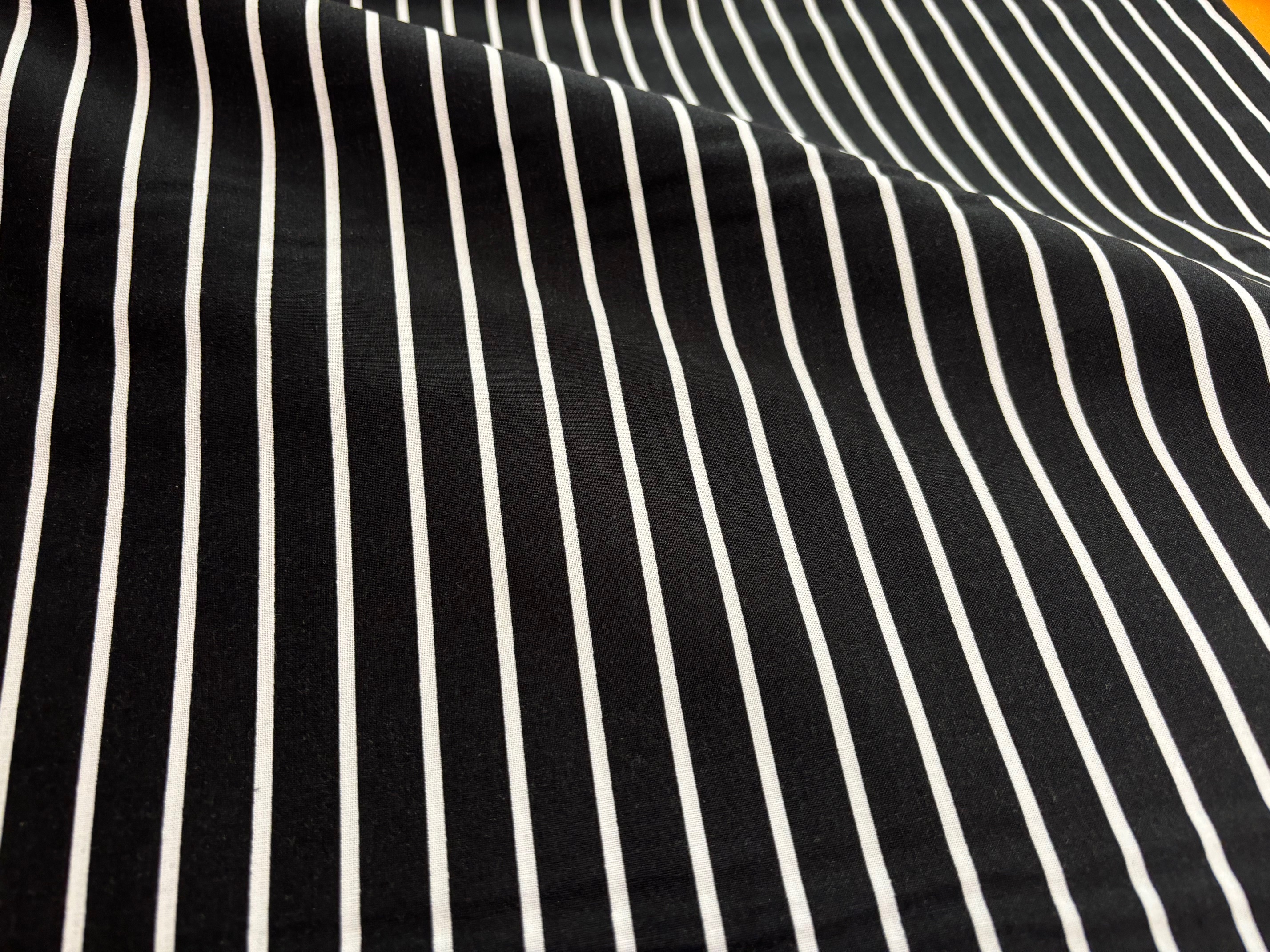 Baumwollstoff mit 3 mm schmalen weißen Streifen und 15 mm breiten schwarzen Streifen. Toller Basic - vielseitig zu kombinieren. Memories Stephanie Organes for andover. 100% Baumwolle, 110 cm breit.