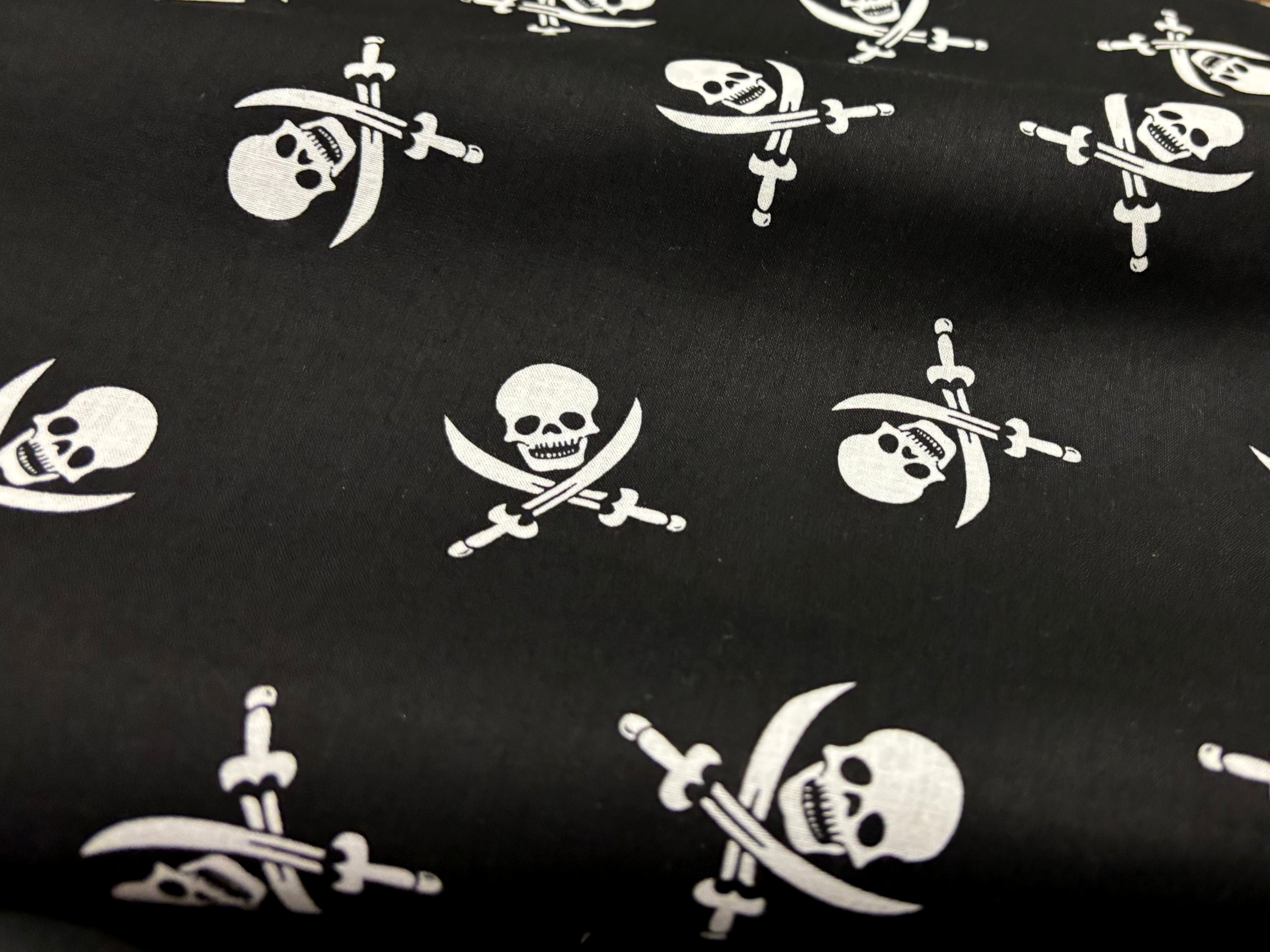 Baumwolldruck mit Totenköpfen und gekreuzten Schwertern ( 5 x 5 cm) in Weiß auf Schwarz. 100% Baumwolle, 140 cm breit. Stoff mit klassichem Piratenmotiv, toll auch für Faschingskostüme.