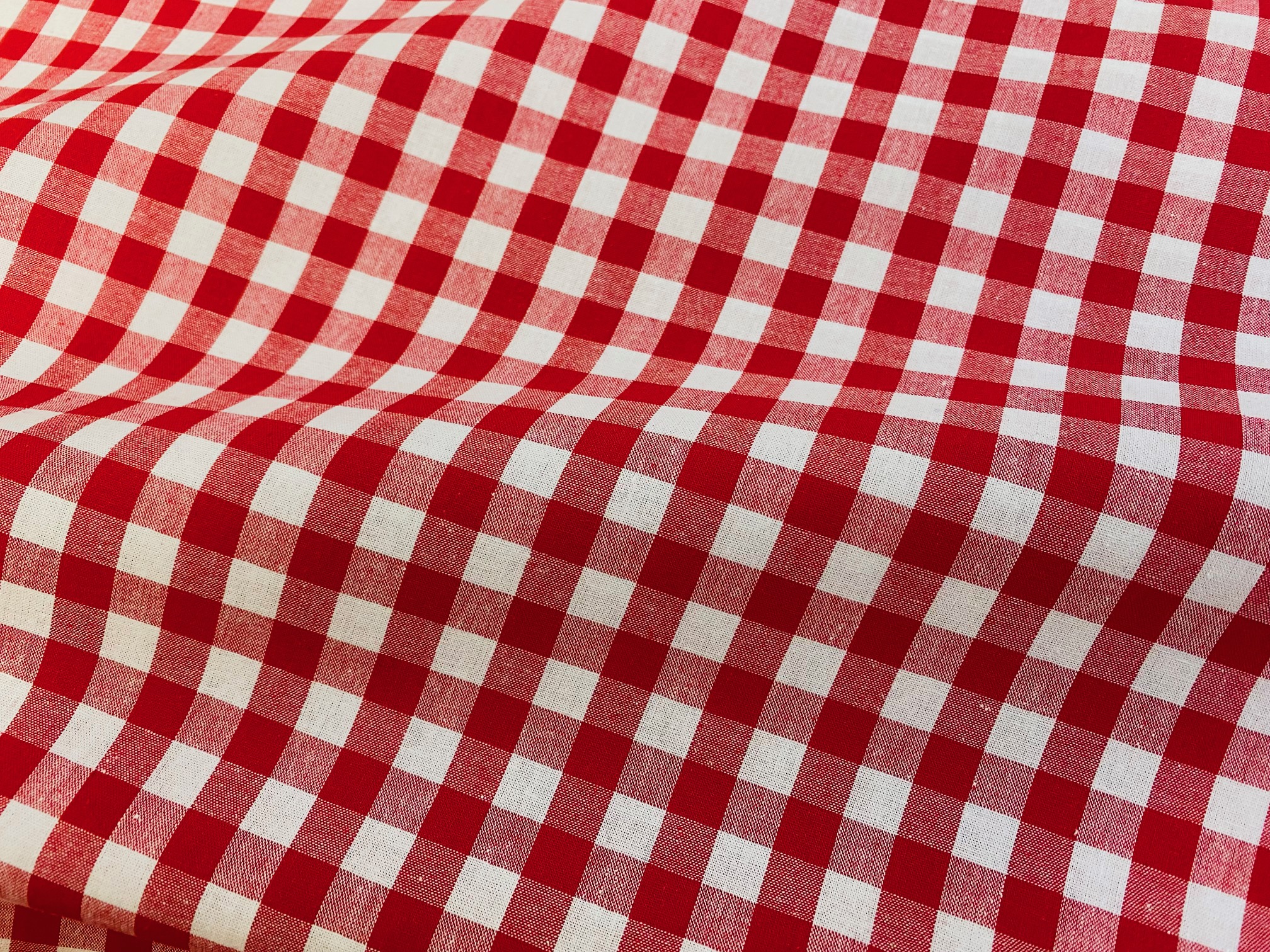 Baumwolldruck mit großem Vichy-Karomuster in Rot/Weiß (10 mm), 100% Baumwolle, 145 cm breit. Für Küchenvorhänge, Tischdecken, Heimtextilien, Accessoires und mehr.