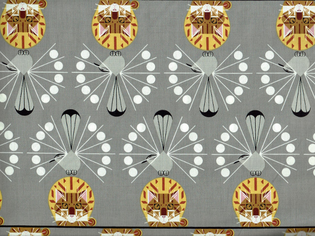 Bio-Baumwoll-Druck von Charley Harper für Birch Fabrics, Cats and Raccs, erst auf den 2. Blick erkennbar - stilisierte Katzen bzw. Löwen ( 5 cm ) in Gelb und Vögel ( 7 cm ) in Grau. Raffiniert! 100 % Bio-Baumwolle, 110 cm breit