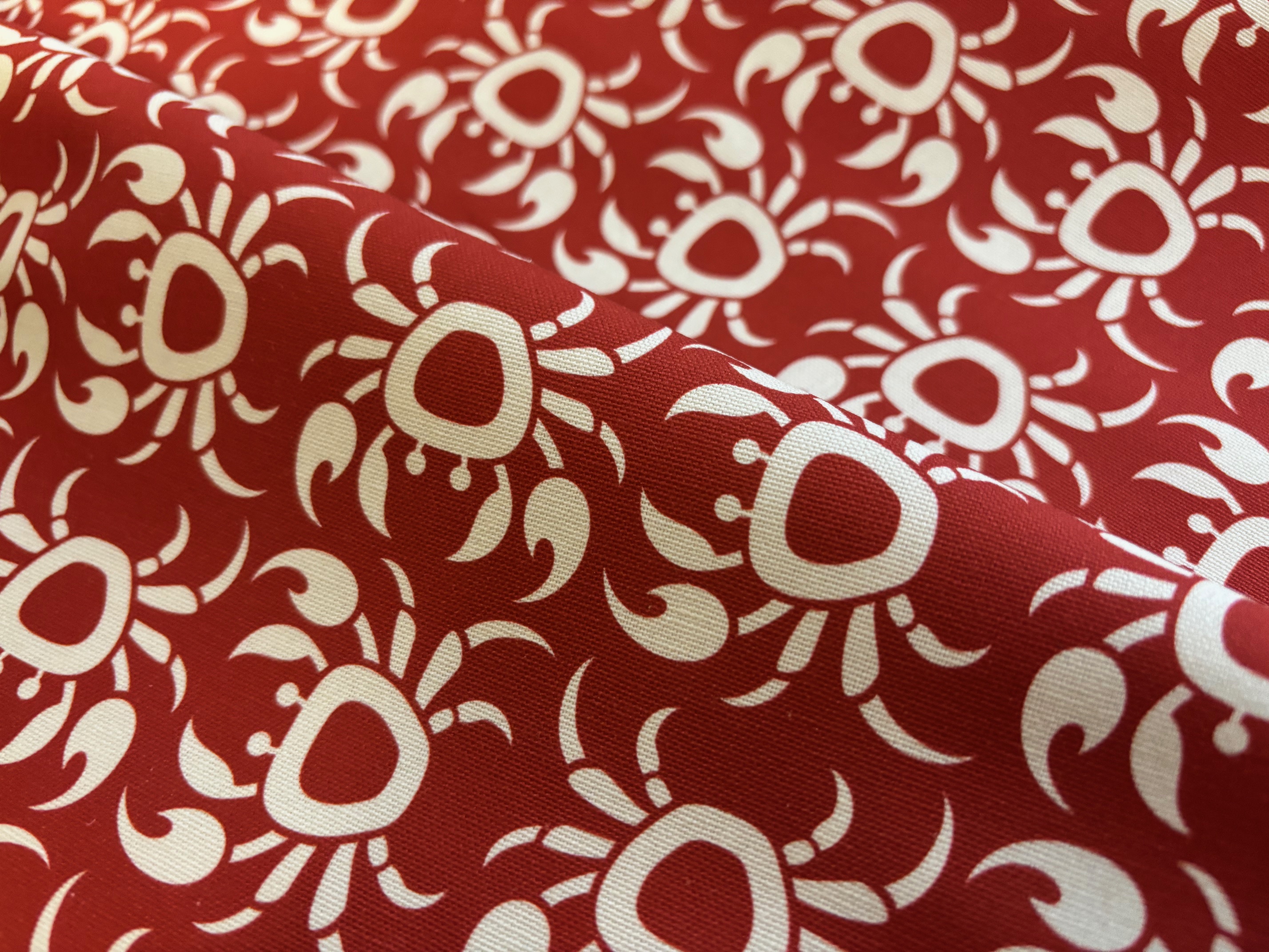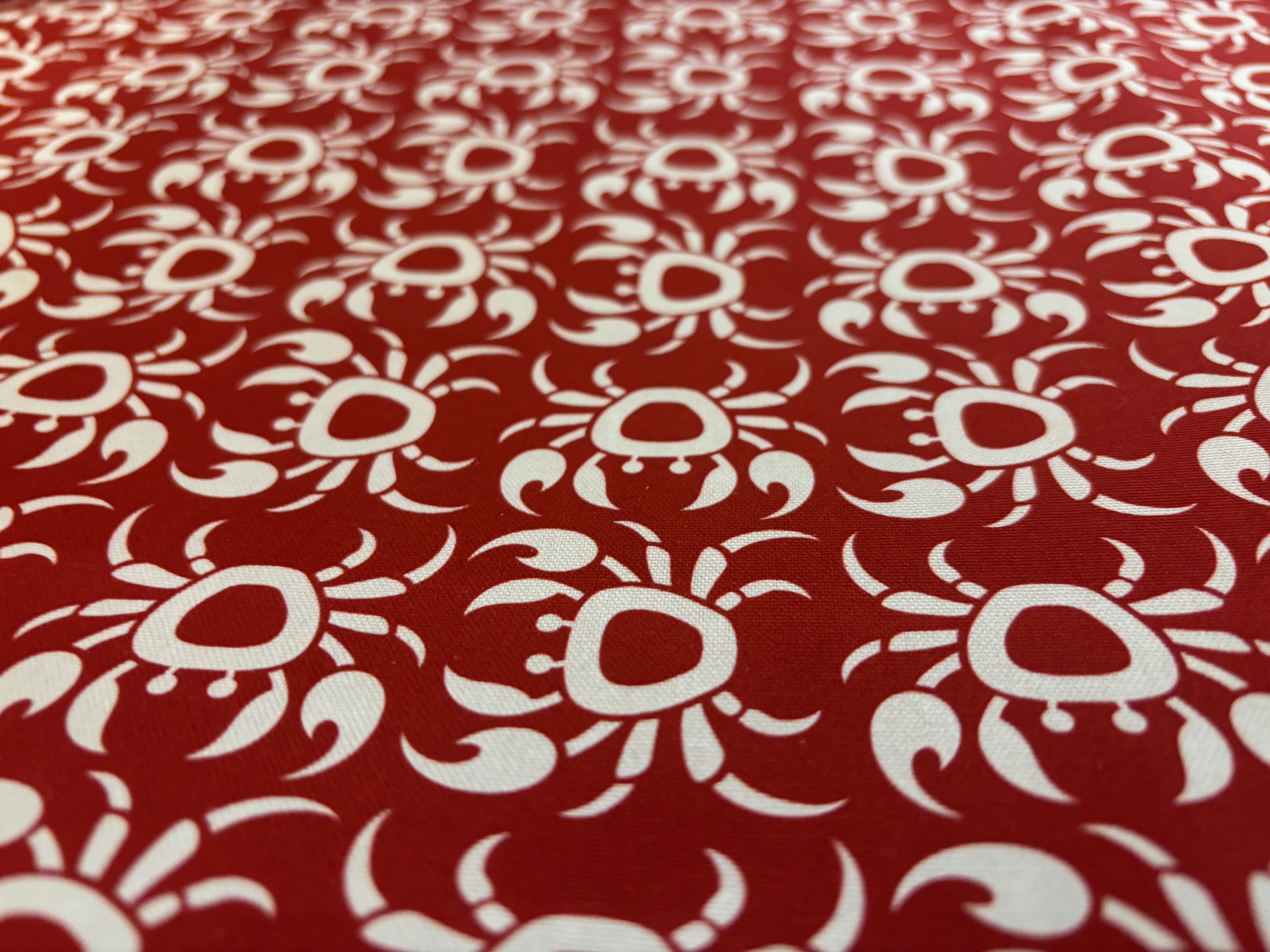 Hier krabbeln die Bio-Krebse (6 x 5 cm) im Rapport. Tolles Design von Cloud9. Krebse in Naturweiß auf Knallrot. Super für Taschen, Kissen, Vorhänge, Kleidung - was immer Dir einfällt. 100% Bio-Baumwolle in festerer Qualität. 110 cm breit.