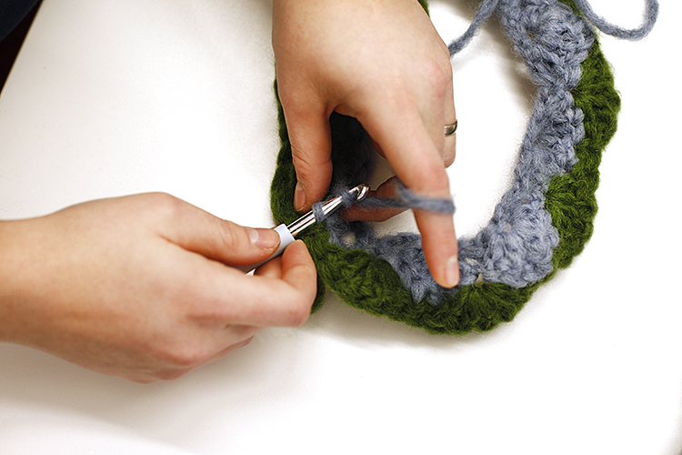 2 bis 3 Kettmaschen auf der Rückseite hochhäkeln um den Farbwechsel zu kaschieren.