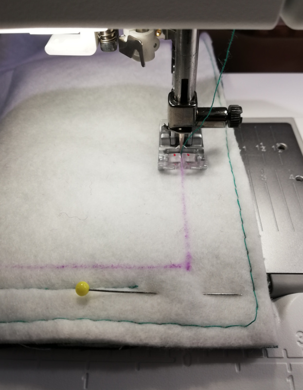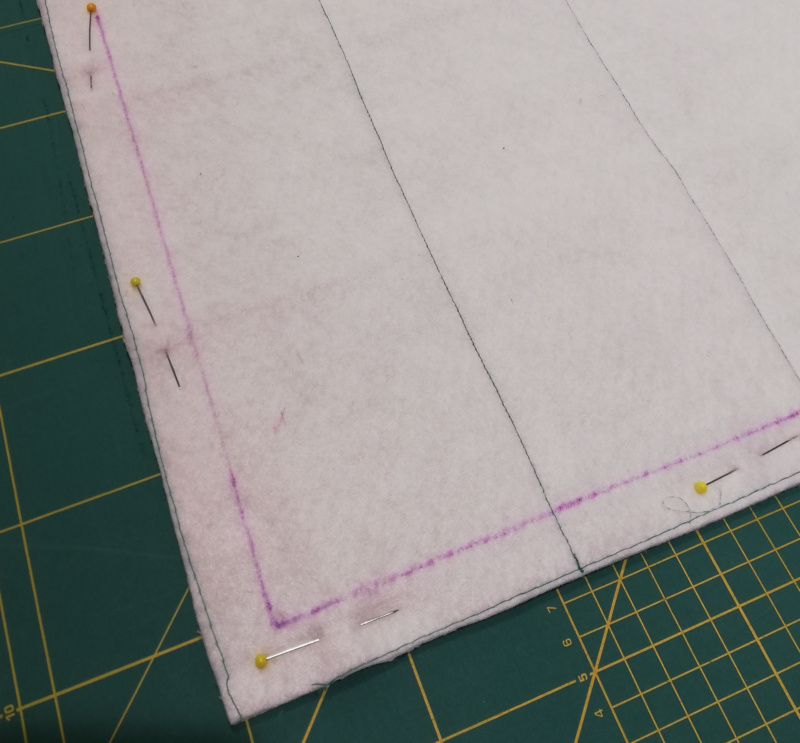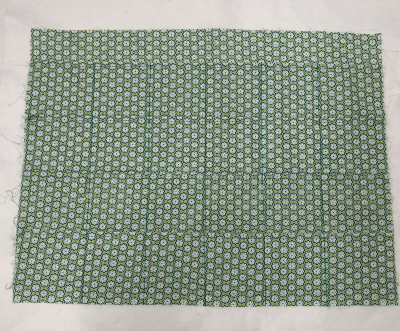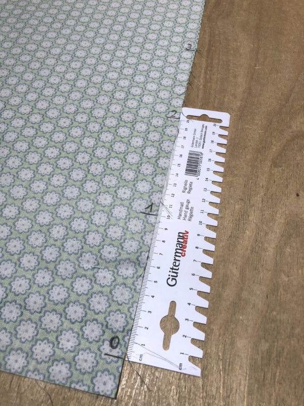 Nun zeichnest du ringsherum eine Nahtzugabe von idealerweise 2 cm an. Wichtig ist aber, dass die Fächer ganz rechts und ganz links auch 10 cm breit sind. Bitte hier noch einmal genau nachmessen und die Nahtzugabe eventuell anpassen. Nun werden diese Linien nachgesteppt.