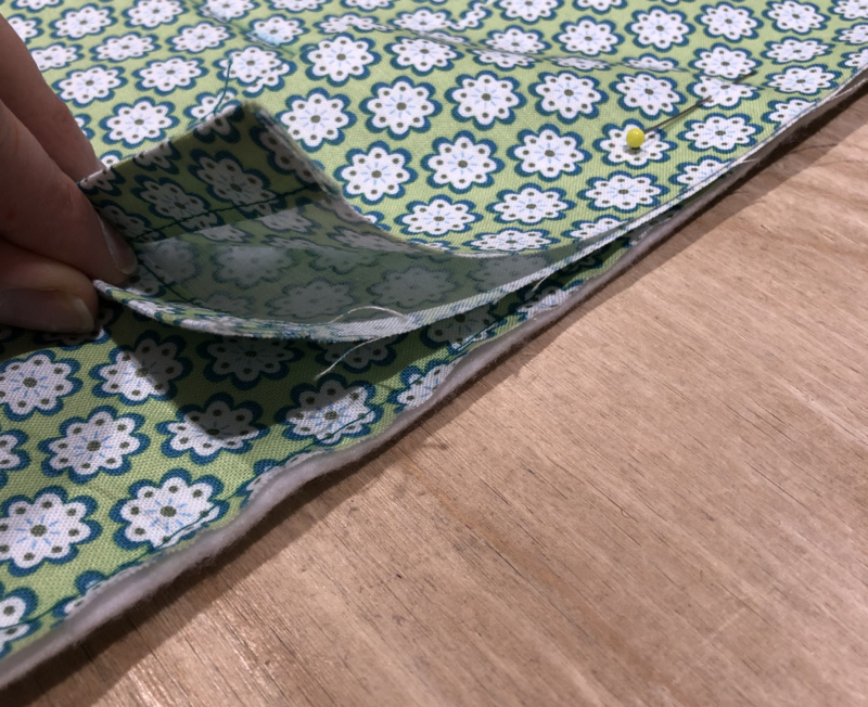 Bevor du alles wendest, schneide die Nahtzugabe ringherum auf 1 cm zurück und schneide die Ecken vorsichtig zurück. Danach wendest Du alles durch die Öffnung auf die schöne Außenseite.