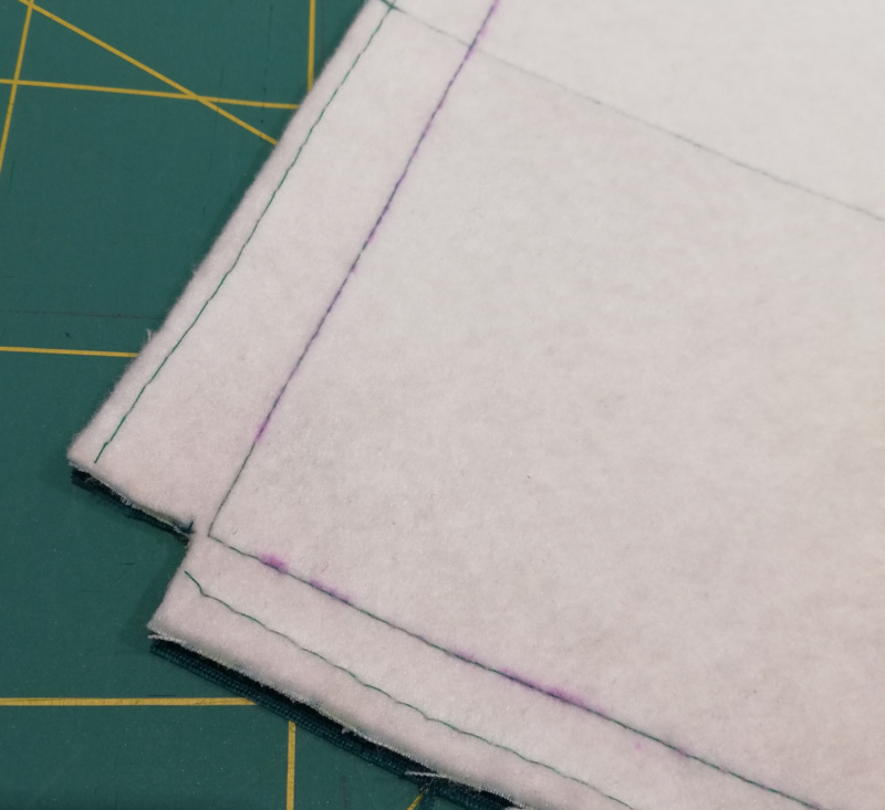 Nun nähst Du den gesamten Oberstoff einmal auf dem Thermolam rundherum knappkantig auf. Am einfachsten geht das, wenn Du die Stichlänge Deiner Maschine auf Maximum stellst. Danach schneidest Du das Thermolam rundherum bündig mit der Stoffkante ab.