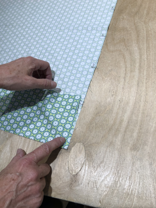 Wenn alles passt, stecke die Reihen mit ein paar Stecknadeln fest, und lege den Stoff vorsichtig auf das Stück Thermolam. Das Thermolam ist absichtlich etwas größer. Streiche deinen Stoff von der Mitte heraus an den Rand glatt, bis alles schön übereinander liegt. Dann kannst Du den Stoff mit Stecknadeln auf dem Thermolam fixieren, am besten von der Mitte heraus sternförmig nach außen, damit nichts verrutscht.