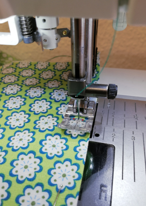 Als nächstes werden die so entstandenen vier Bruchkanten füßchenbreit oder mit einem schönen Zierstich von der rechten Seite sichtbar abgesteppt.