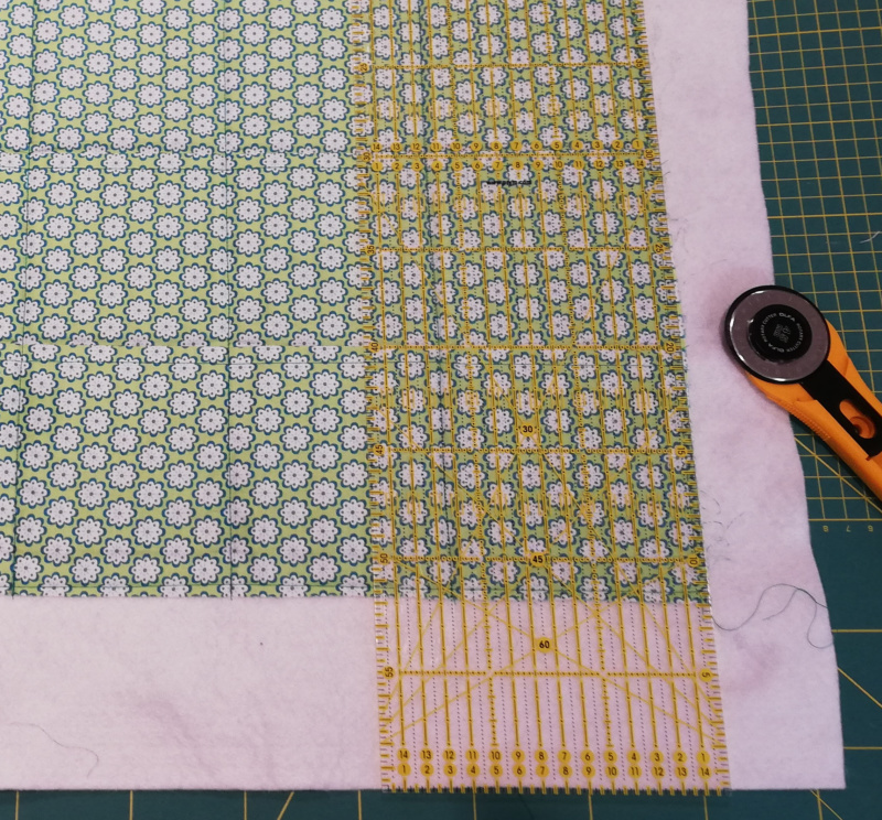 Am einfachsten schneidest Du nun die 3 Teile – Oberstoff, Futter und Rückseite in den oben angegebenen Maßen zu. Besonders genau gelingt das mit einem Rollschneider auf einer Schneidematte. Eine Anschaffung, die sich lohnt, wenn man viel näht und geometrische Formen zuschneidet, z.B. bei einer Patchworkdecke.