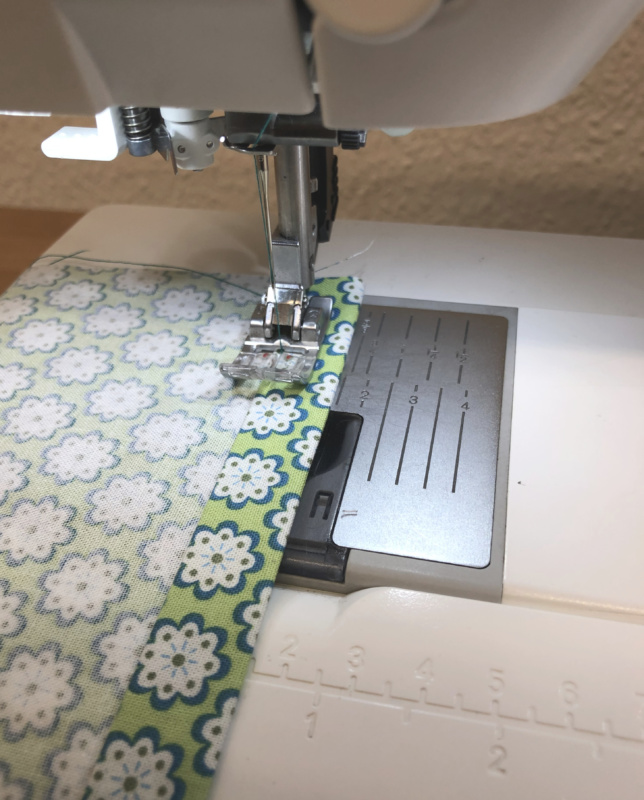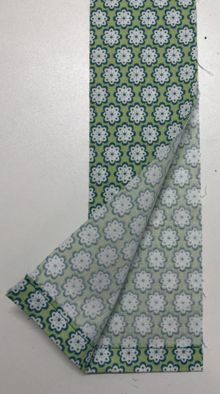 Die kurzen Seiten des Streifens bügelst Du um, und zwar 1 cm und nochmal 1 cm. Der so entstandene Saum wird dann knappkantig abgesteppt. Danach bügelst Du den Streifen längs zur Hälfte, so dass die schöne Seite Außen liegt.