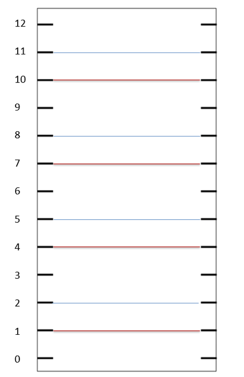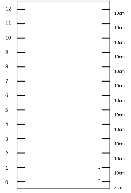 Um nicht durcheinander zu kommen, nummerierst Du Dir am besten die 10 cm Linien von unten nach oben. Die unterste Markierung bekommt eine Null. Das wird die später die untere Kante des Adventskalenders, mit den 2 cm Nahtzugabe.