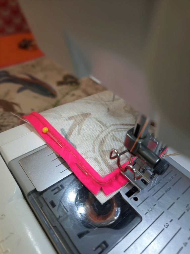 Wenn Du um die Ecke nähst, dann sorge dafür, dass die Nadel bei Nähstopp im Stoff stecken bleibt. Das geht übrigens von alleine, wenn Du eine Computernähmaschine hast, die eine sogenannte „Nadelhoch/-tiefstellung bietet. Wenn sie aktiviert ist, bleibt die Nadel bei Nähstopp automatisch im Stoff.