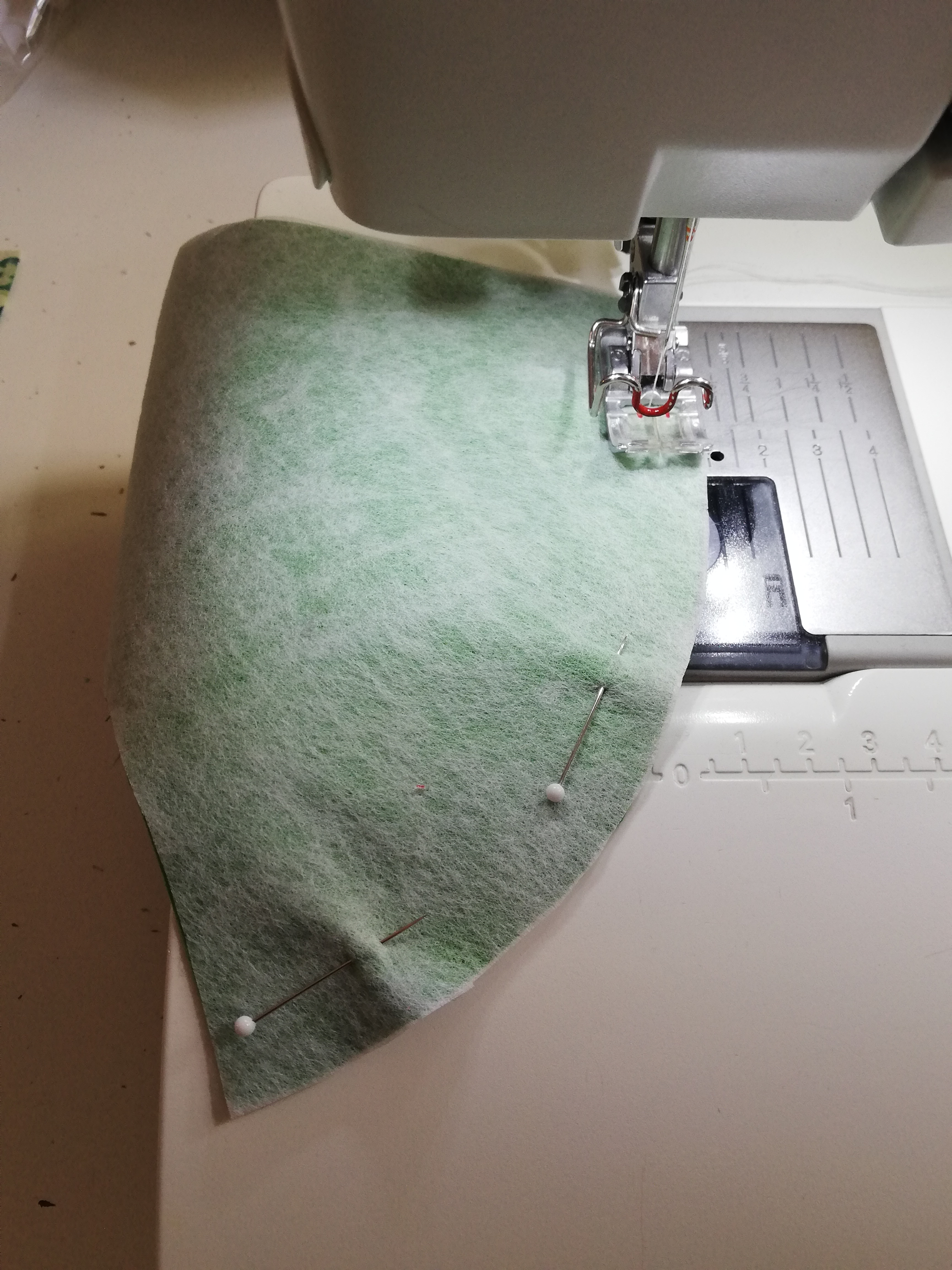 Außenstoff rechts auf rechts aufeinanderlegen (die schönen Seiten liegen innen), an der runden Mittelnaht zusammenstecken und mit 7 mm Nahtzugabe zusammennähen.