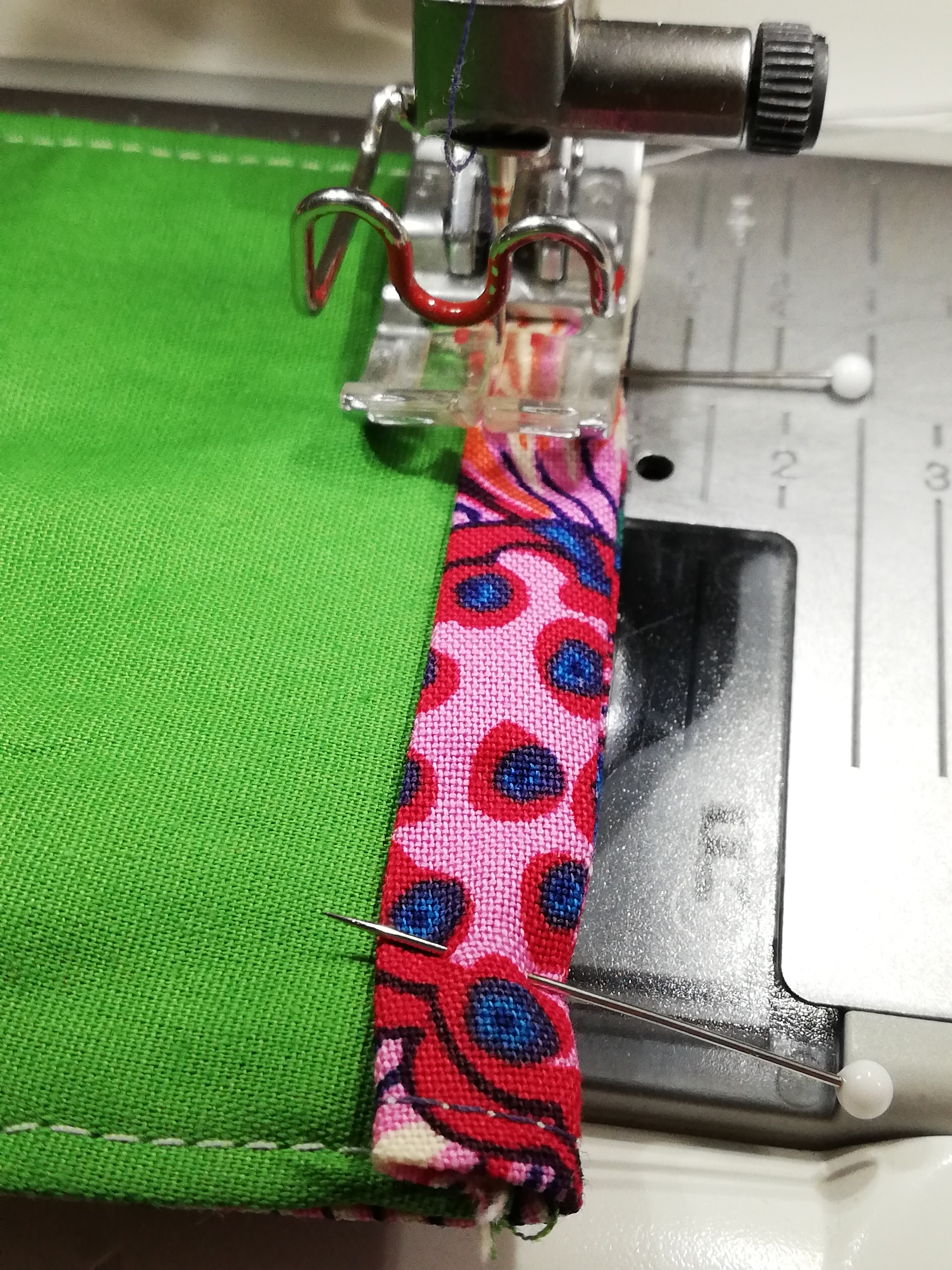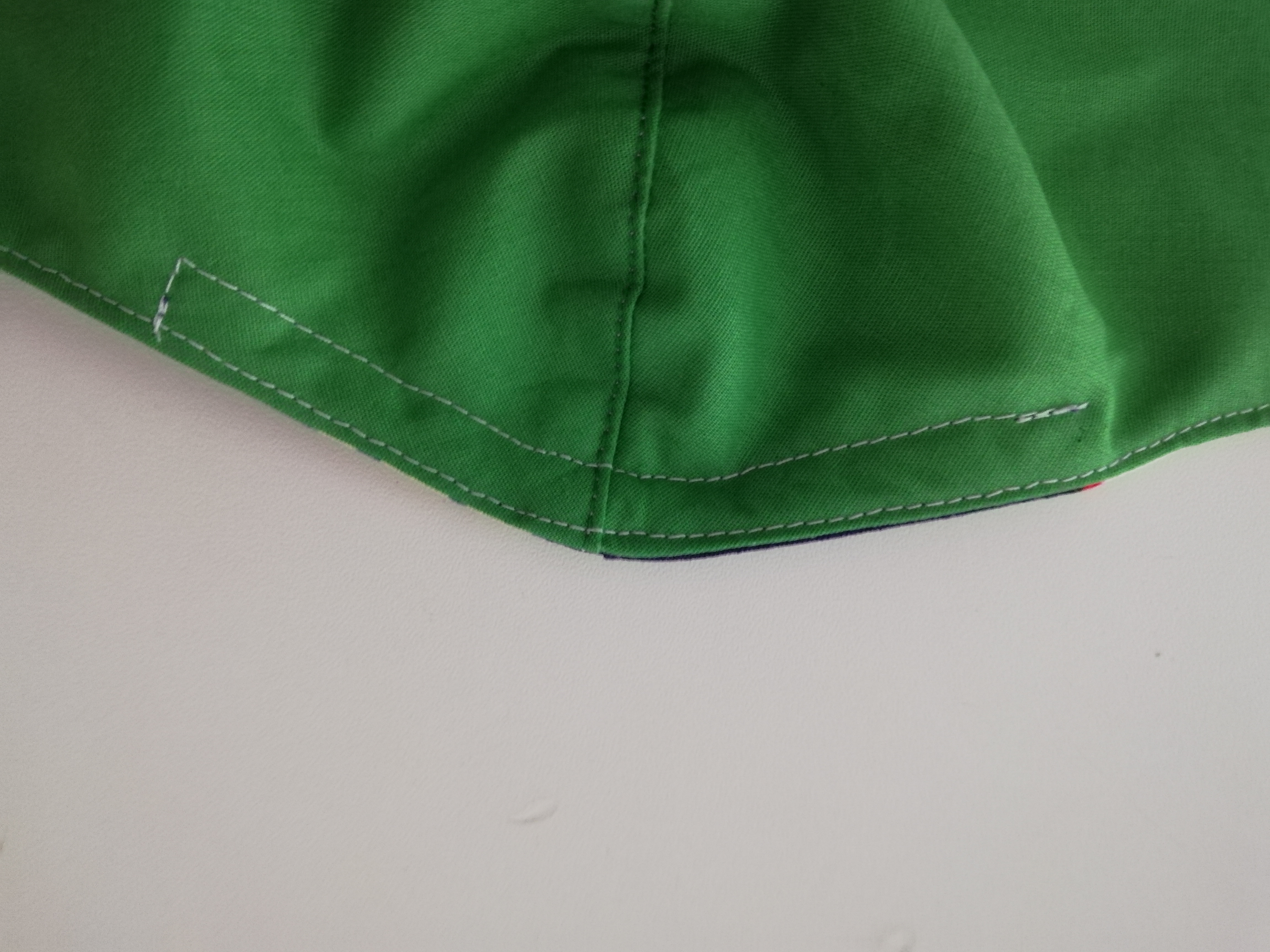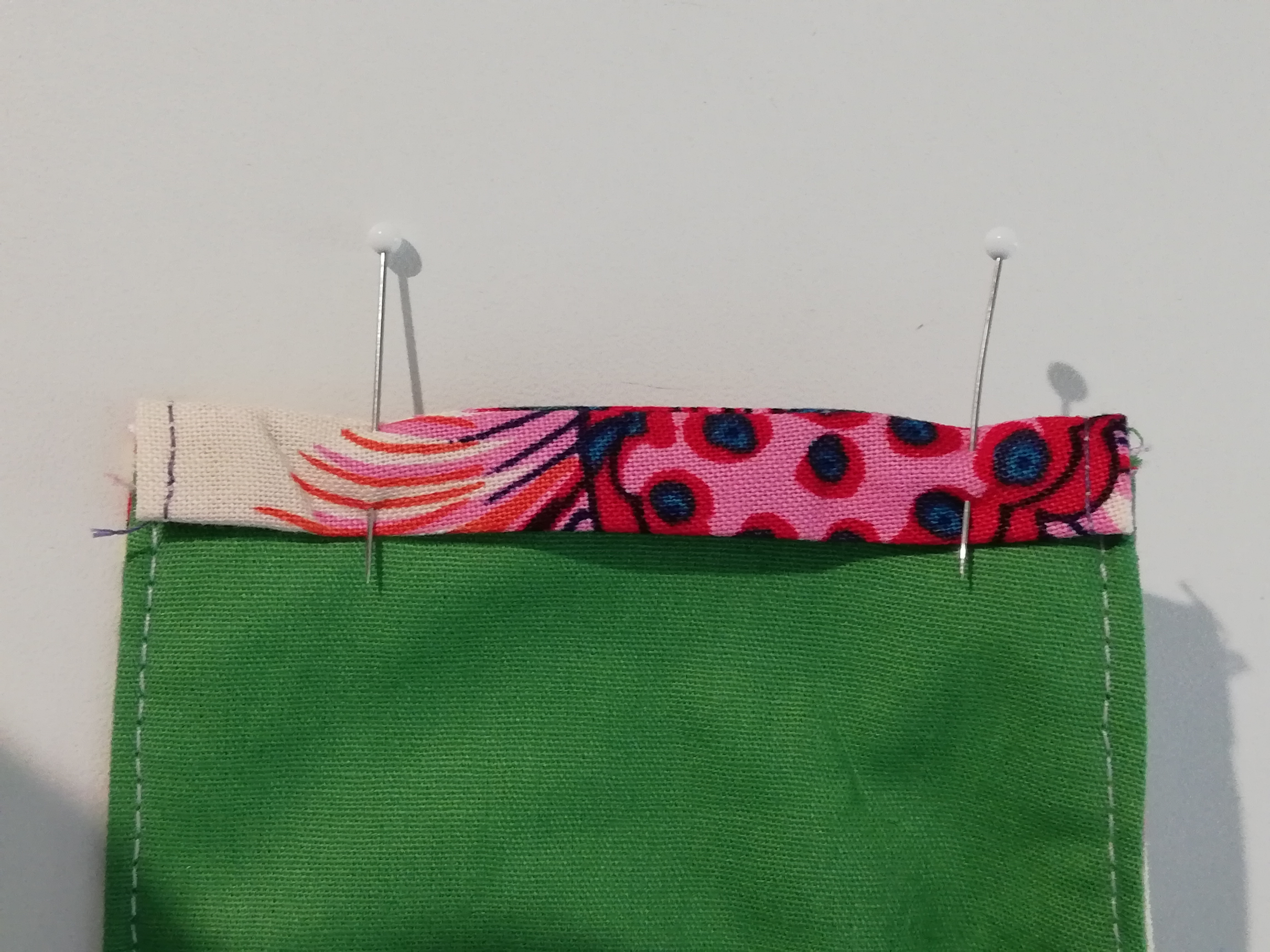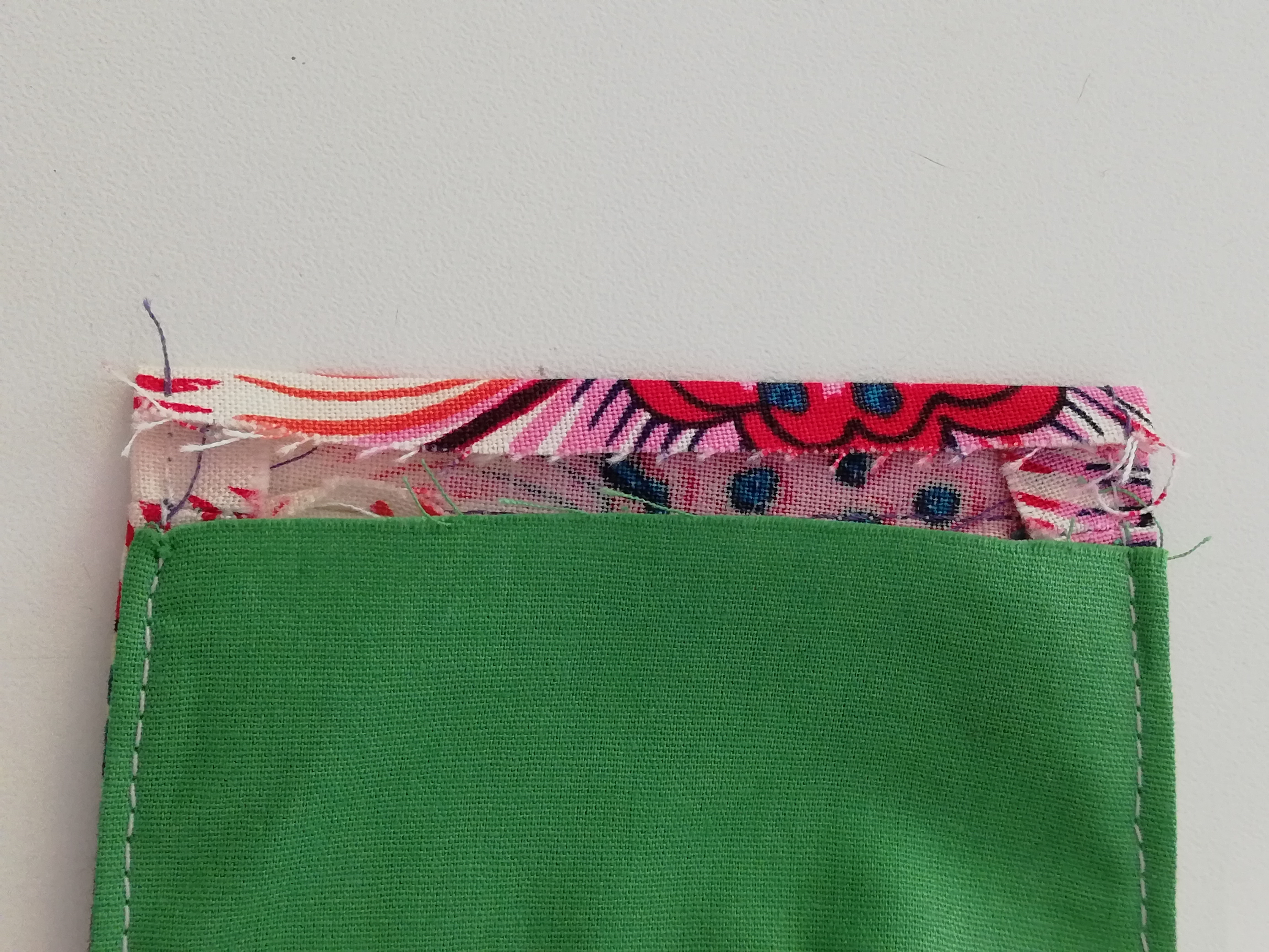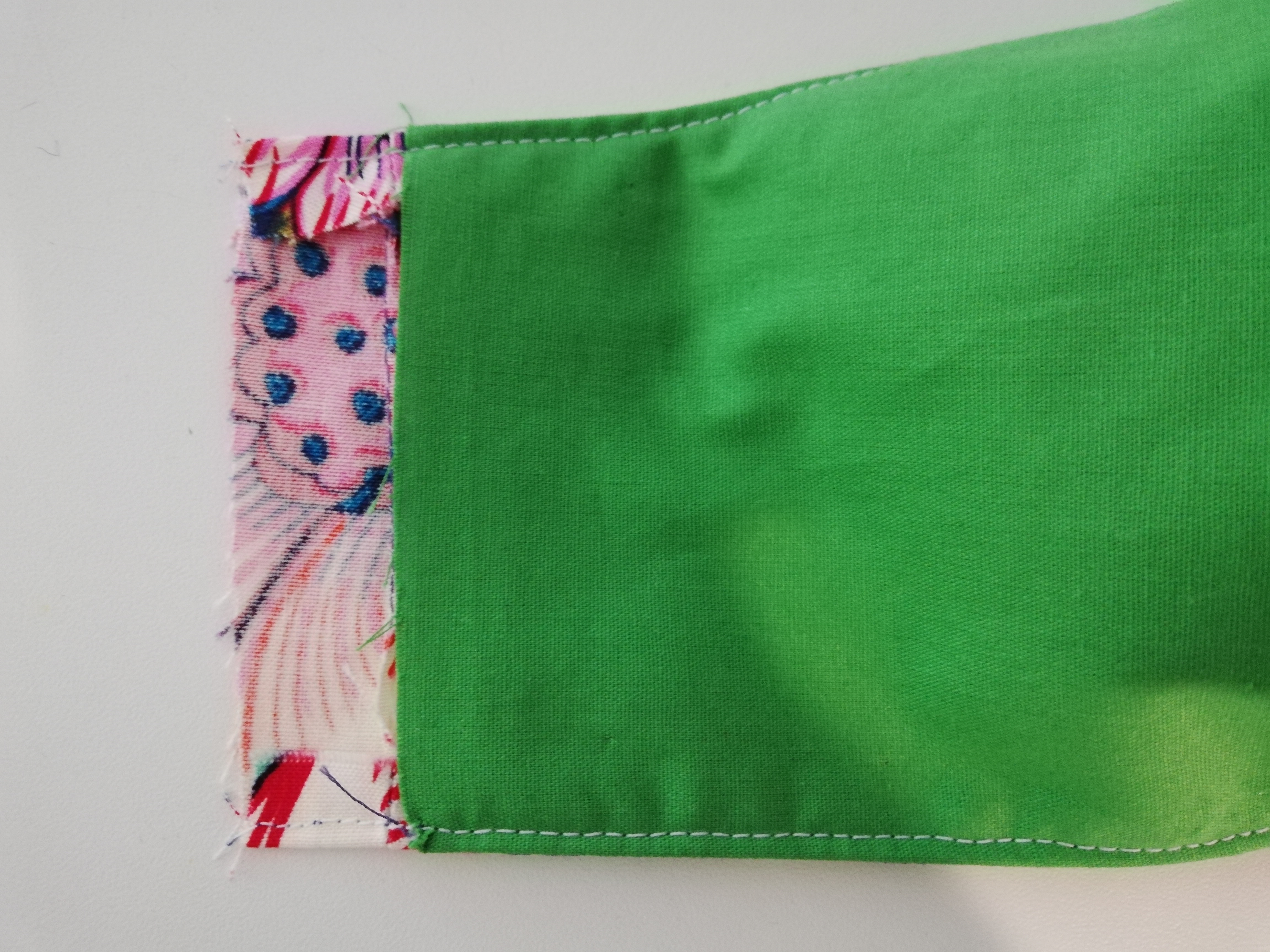 Die Maske auf die rechte Seite wenden, die Kanten gut bügeln und die obere und untere Kante knappkantig absteppen.