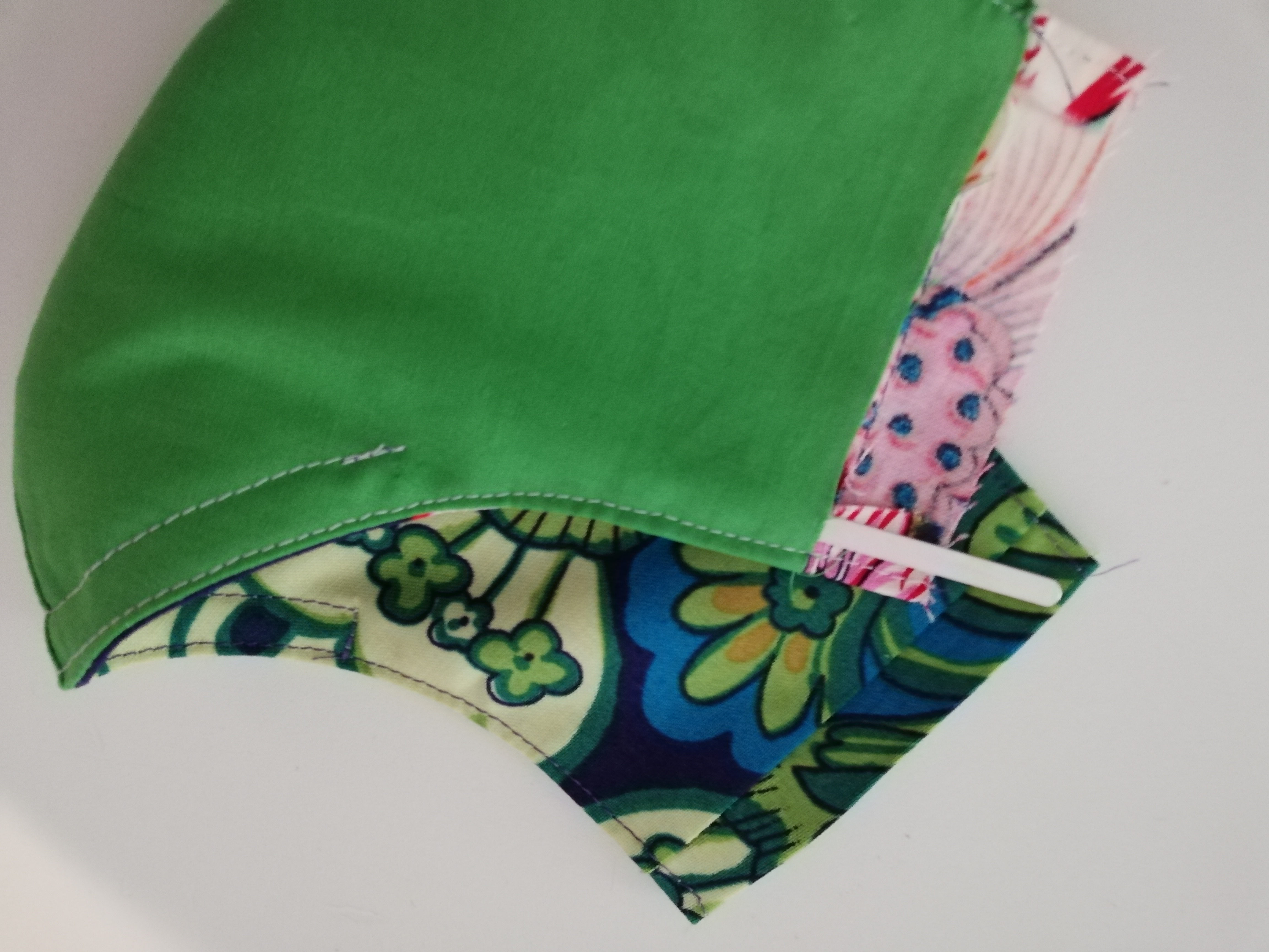 An der Rundung die Nahtzugabe von der linken Stoffseite bis kurz vor die Naht einschneiden, dann legt sich die Rundung besser. Achtung: nicht in die Naht schneiden.