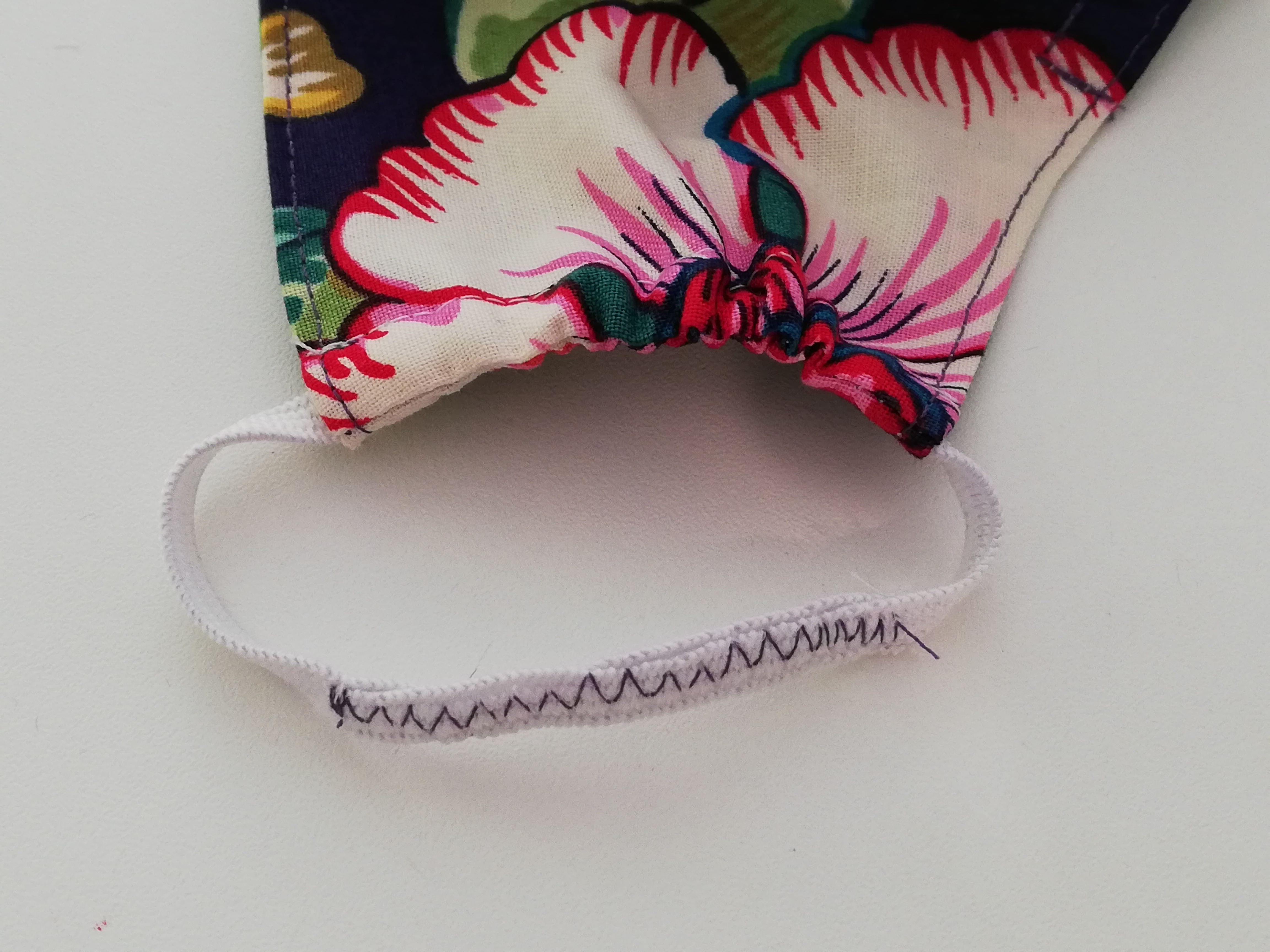 Überlegt euch, ob das Gummiband hinter die Ohren soll oder um den ganzen Kopf herum. Die Längen müsst ihr dann entsprechend anpassen. Dann mit Sicherheitsnadel oder der Prym Durchziehnadel durch den Tunnel ziehen, Sitz final anpassen, die Enden ca. 4 cm übereinanderlegen und mit einem Zickzackstich festnähen. Oder einfach knoten.