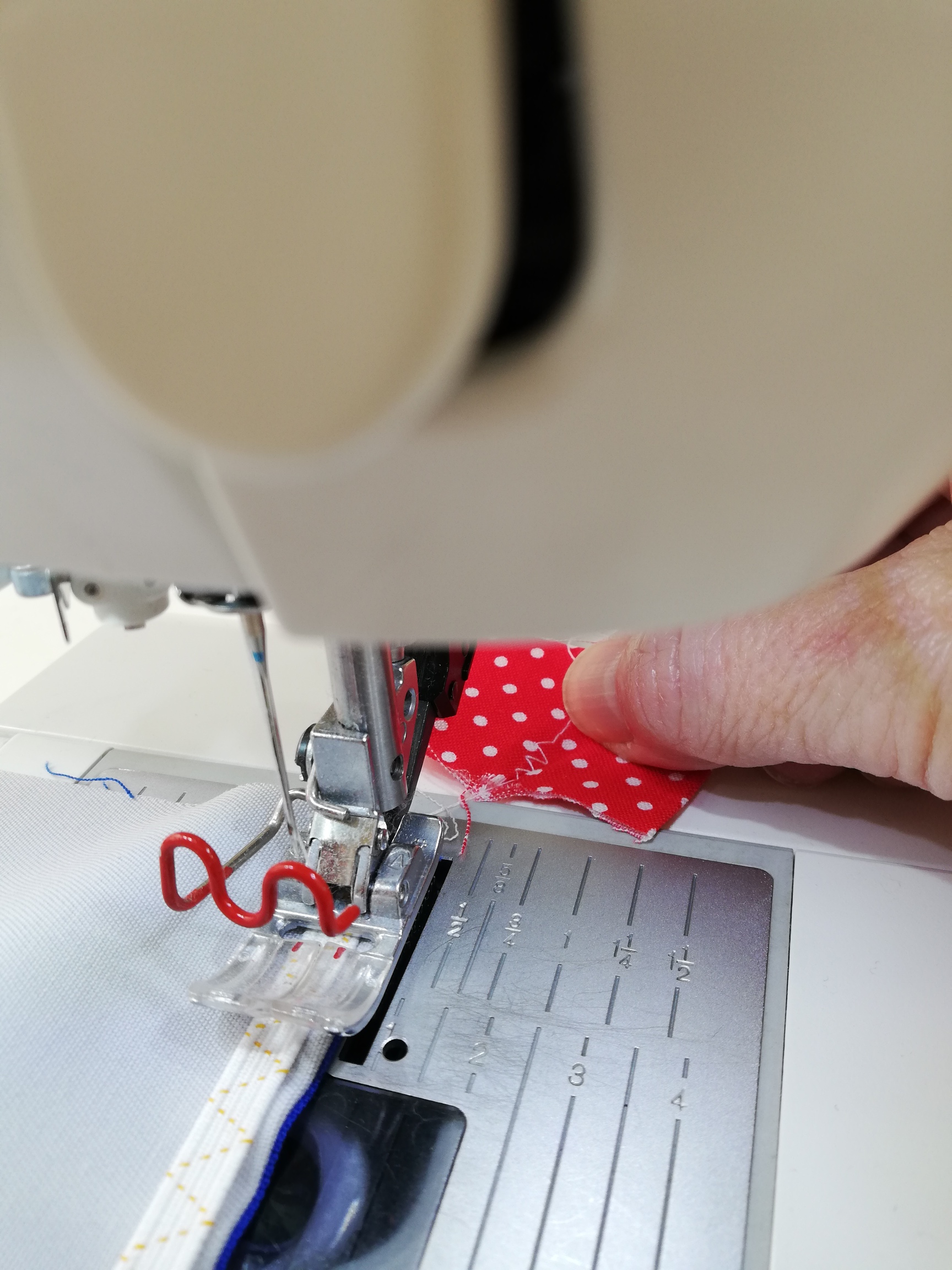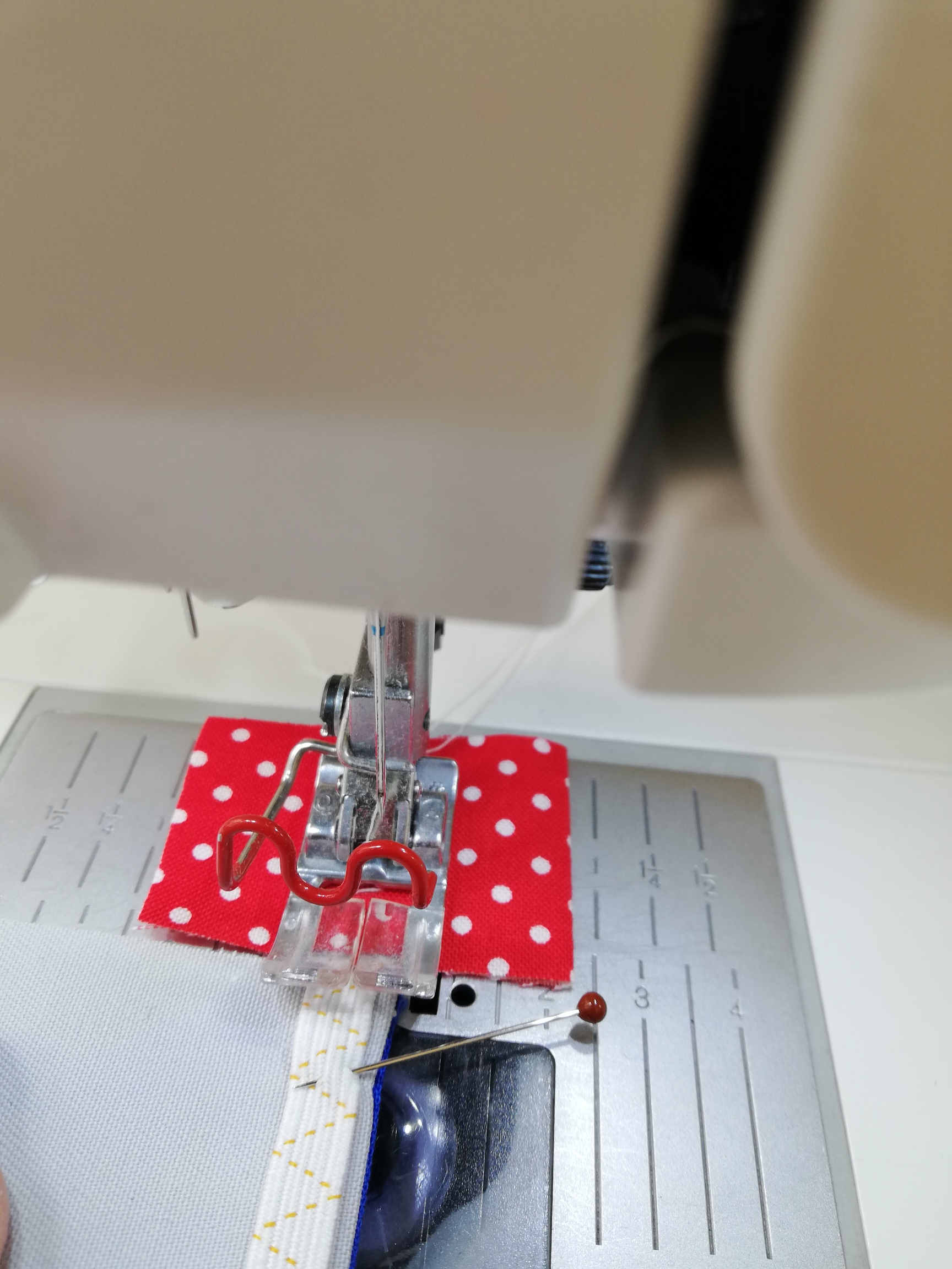 Nehmt ein kleines Stoffstückchen und legt es unter das Nähfüßchen und näht darüber. Sobald ihr am Ende des kleinen Stoffstücks angekommen seid, schiebt ihr die Maske direkt hinterher und verriegelt am Anfang der Maske die Naht. Damit ist das Gummi schon mal fixiert. Nun das Gummi spannen, dabei könnt ihr an dem kleinen Stoffstück etwas ziehen, um der Nähmaschine zu helfen, den Stoff vorwärts zu transportieren. So entsteht die Sapnnung. Am Ende wieder gut verriegeln und dann das Stoffstückchen abschneiden.