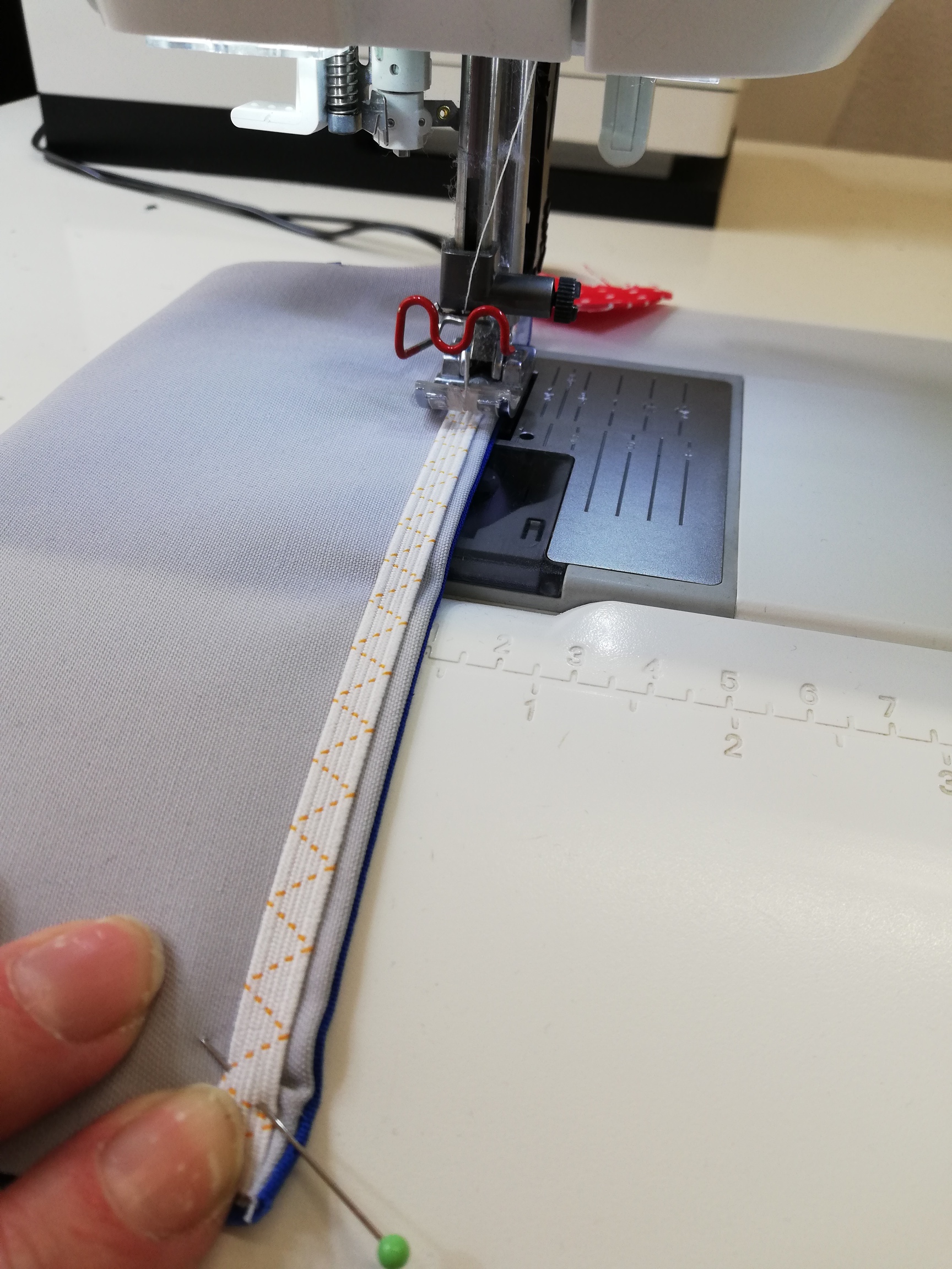 Das Gummiband wird auf der Rückseite der Mund- und Nasenmaske aufgesteppt.