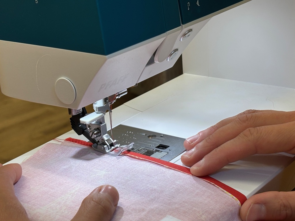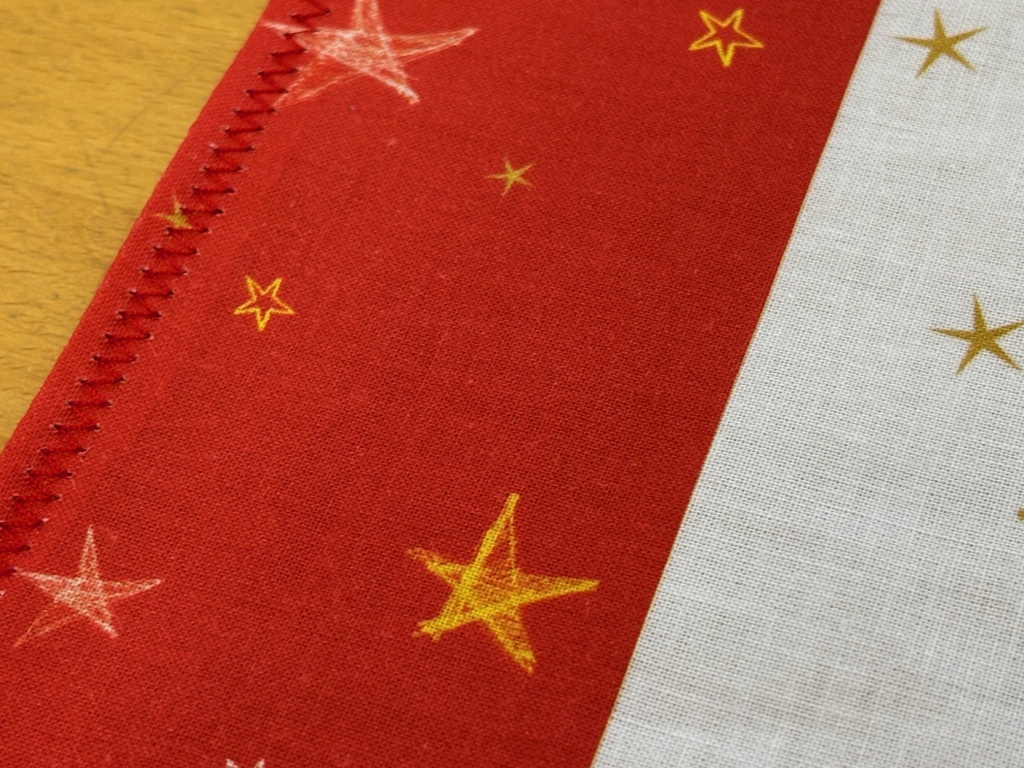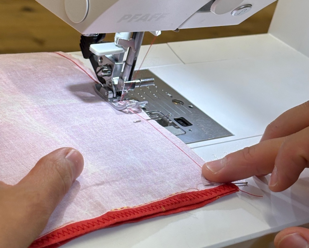 Fädle rotes Garn ein und stelle den Zickzackstich ein. Übernähe den Saum von der linken Seite. Fertig.