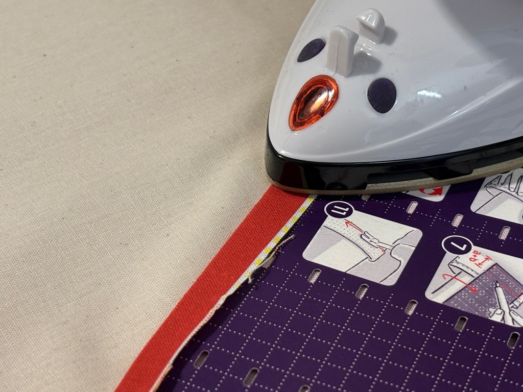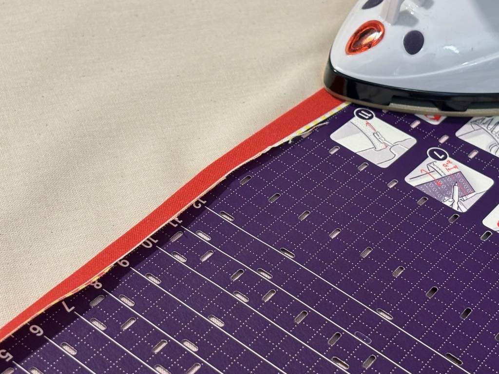 Als erstes bügelst Du den oberen Saum des Säckchen 5 mm um. Unser Tipp: besonders einfach und präzise geht das mit einem PRYM Bügellineal. Damit kann man Messen, Falten, Bügeln in einem Arbeitsgang. Es hat entsprechende Skalen zur Orientierung und ist absolut bügelfest. Das Bügellineal ist also auch generell ein cleverer Helfer für alle Arten von Säumen.