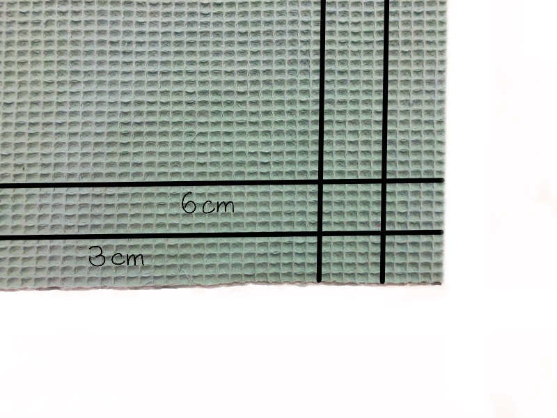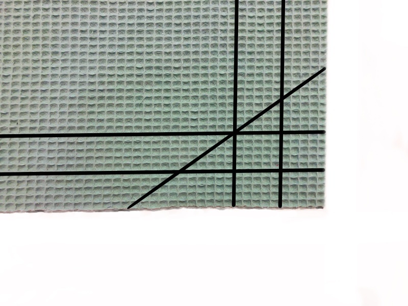 Nun malt ihr je 3 und 6 cm entfernt von der Kante eine Linie auf. Bei mir ist dies hier ein Stück Probestoff, wie ihr im Video seht, schließen die inneren Linien eigentlich mit dem Volumenvlies ab. Die innere Linie ist von außen betrachtet die spätere Kante. | Außerdem zeichnet ihr noch eine Diagonale ein, diese hat einen Winkel von 45 Grad und geht durch die innere Kreuzung der Markierung. Wie man auf dem Bild ein bisschen erkennen kann, habe ich nun versucht die äußeren Linien und die diagonale Linie zu bügeln, wenn ihr kein Waffelpiqué verwendet würde ich das auch empfehlen, dass Piqué lässt sich allerdings nicht gut bügeln. |