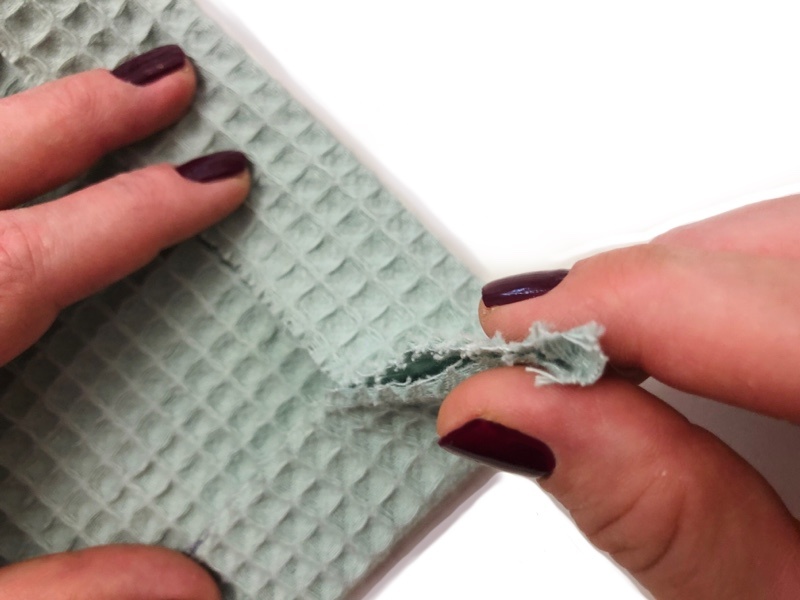 Im Falle meiner Patchworkdecke, wollte ich, dass der Rand am Ende 3 cm breit ist. Ich habe den Waffelpiqué also 6 cm länger stehen lassen als mein Volumenvlies. Außerdem möchte ich, dass der Rand schön dick und flauschig wird, ich möchte ihn also 2 mal gleich breit einschlagen können.