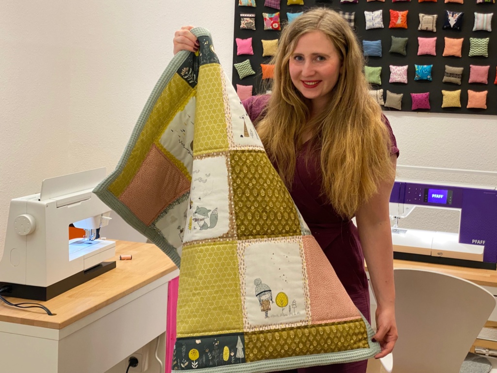 Mit meinen Tipps und Tricks und den Briefecken, mit denen wir unserer Decke ein perfektes Finish geben, gelingt die Krabbeldecke auch Nähanfängerinnen im Handumdrehen. Und wenn ihr das Prinzip verstanden habt, dann muss es ja keine Babydecke werden, es kann auch eine kleine Patchworkdecke für Dein Sofa werden, ein Blickfang auf Deinem Sessel – warum nicht? Alles ist möglich. Das ist eben Patchwork!