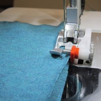 Jetzt wird es interessant. Höherwertige Nähmaschinen (z.B. PFAFF ambition, expression) bieten nämlich Overlockstiche, mit denen man – wie mit einer Overlock – zwei Stoffteile zusammennäht und die Stoffkante gleich mitversäubert. Wie das aussieht, seht ihr unten. Beim Zusammennähen haben wir den PFAFF Blindstichfuß verwendet, er ist bei allen PFAFF Nähmaschinen mit dabei. Vielleicht findet ihr ihn auch beim Zubehör eurer Nähmaschine. Mit dem Blindstichfuß kann man nämlich nicht nur Rock- oder Hosensäume nähen, sondern auch dehnbare Stoffkanten sauber zusammennähen. Das rote, verstellbare Rädchen wird ganz nach rechts gedreht. Blindstichfuß einsetzen und die Stoffteile so ausrichten, dass das Rädchen direkt an der Stoffkante entlang läuft. Dadurch hat man eine gute Führungsorientierung. Die Nadel sticht immer knapp außerhalb der Stoffante ein und fasst sie ein. Das funktioniert wirklich gut.