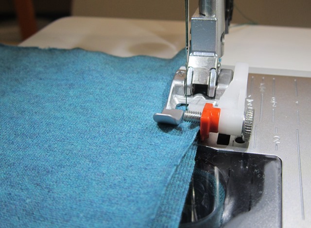 Das Material verzieht sich nicht, weil die Stofflagen von oben und unten synchron gegriffen werden. Beim Bündchen annähen ist das z.B. sehr von Vorteil. Da beim Zusammennähen der Bündchenstoff leicht gedehnt werden muss, sind beide Hände am Stoff. Da kommt es einmal mehr darauf an, dass die Nähmaschine gut transportiert und man so die Richtung halten kann.