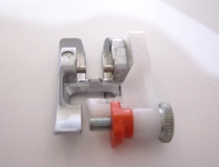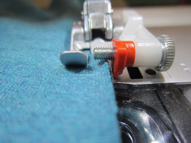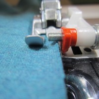 Auch hier ist der Blindstichfuß sehr hilfreich (teilweise im Zubehör von Nähmaschinenmodellen enthalten). Das rote Rädchen lässt sich verstellen und wird ganz nach rechts gedreht. Blindstichfuß einsetzen und die Stoffteile so ausrichten, dass das Rädchen direkt an der Stoffkante entlang läuft. Dadurch sticht die Nadel immer knapp außerhalb der Stoffante ein und fasst sie ein. Der Stich verändert dabei sein Stichbild.