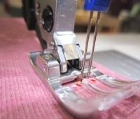 Zwillingsnadeln gibt es in unterschiedlichen Breiten für unelastische Stoffe, aber auch für elastische Materialien. Und genau diese benötigen wir. Für Sweatshirt- und festere elastische Stoffe nimmt man die breitere Version ( Abstand der Nadeln 4.0 mm), für Jerseyshirts ist die schmalere Variante (Abstand der Nadeln 2.5 mm) besser geeignet. Wichtig ist, dass ihr einen zweiten Garnrollenständer für die Nähmaschine habt, denn es werden nun auf dem selben Weg zwei unterschiedliche Garnrollen eingefädelt.